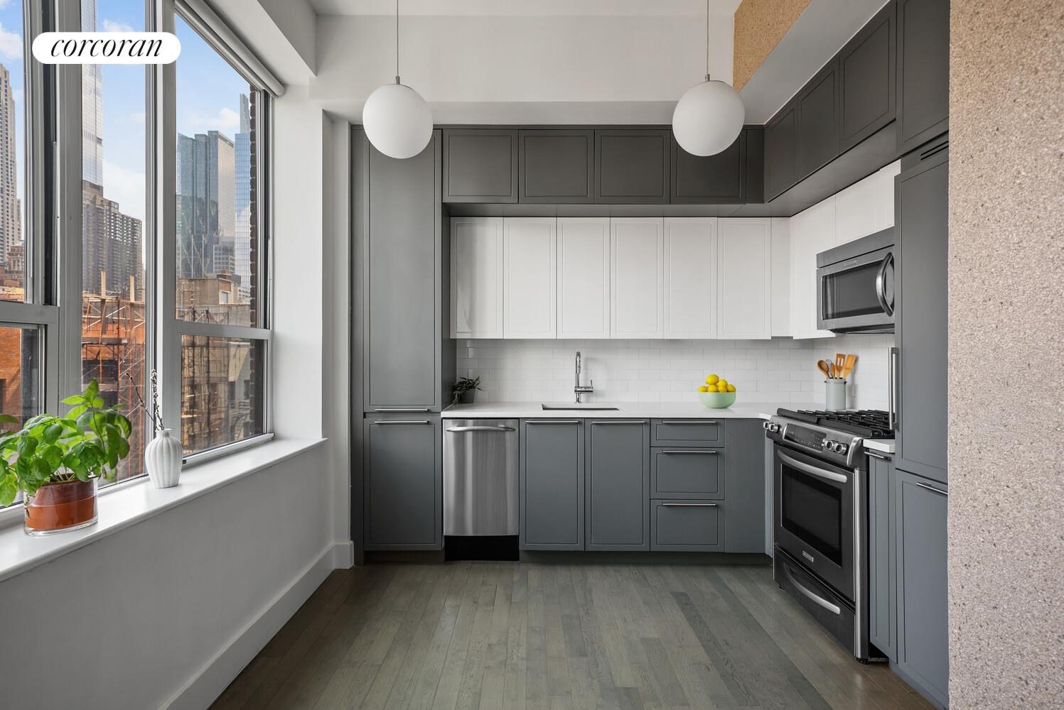 Apt 600 is a light-filled, spacious 1 bedroom apartment with high end finishes throughout, ample closet space, central AC and in-unit washer/dryer. High ceilings add to the airy flow with open concept kitchen, living and dining. The kitchen features white quartz countertops and stainless steel appliances including dishwasher. There are two large closets in the king sized bedroom, which have been fully built-out to maximize storage. Every living space in this home enjoys natural sunlight and views of the city.