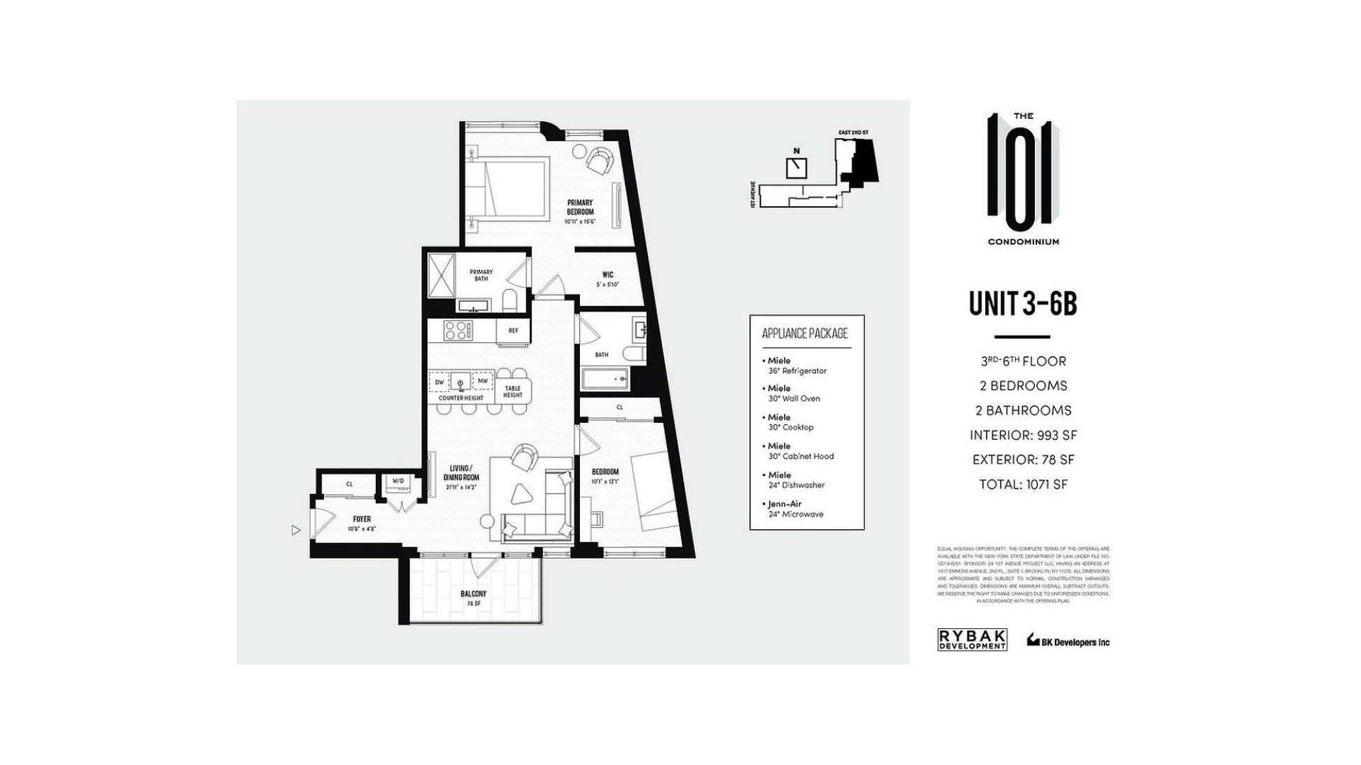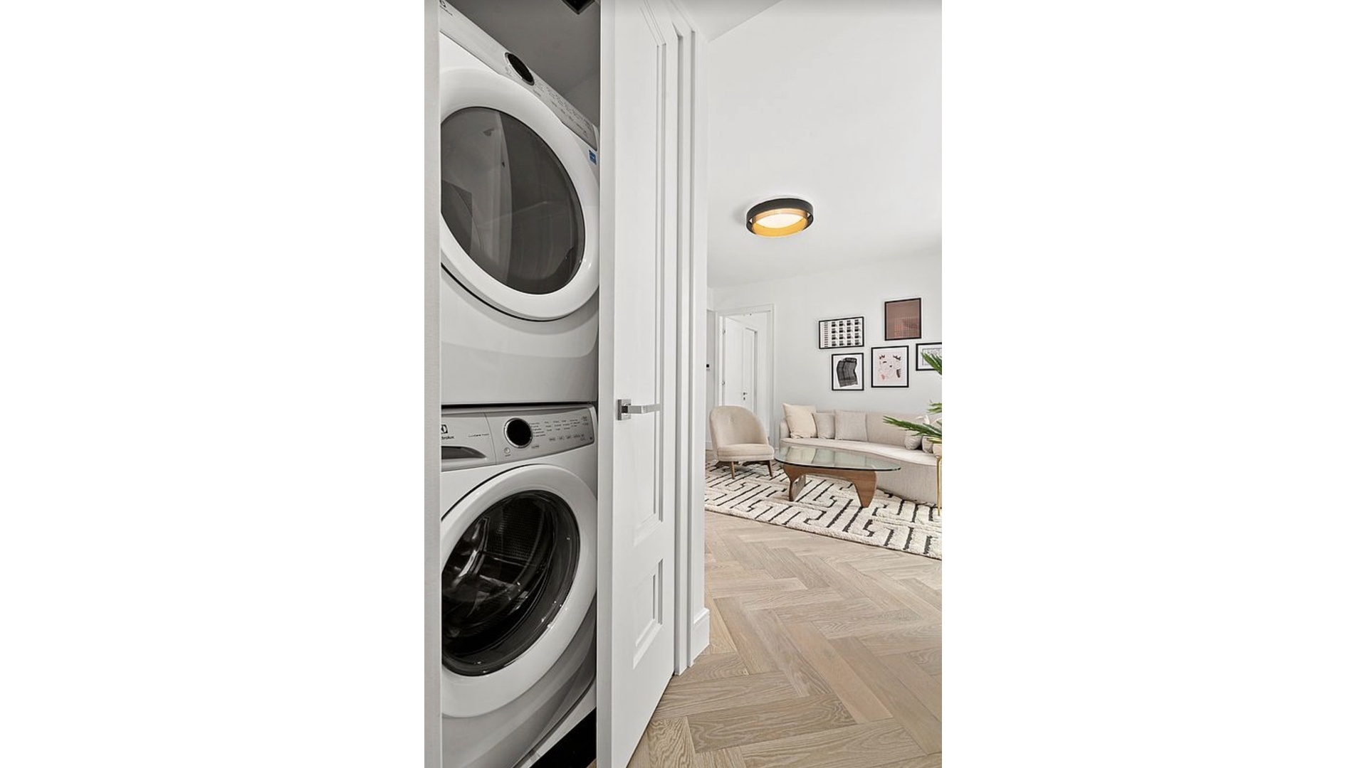 Unit 5B features a truly unique 2-bedroom + 2 full bathroom layout with south facing private balcony and 9'-2" ceilings. This Modern apartment comes with pre-finished European oak herringbone flooring, Mitsubishi concealed slim-duct heating /cooling with VRT independent zoned climate control and UV filtration fresh air circulating, Electrolux vented W/D in the dedicated laundry closet. The Gorgeous Kitchen is equipped with Italian Scavolini custom kitchen cabinetry, global leader German-Engineered Miele appliances with paneled refrigerator and dishwasher, and a sophisticated built-in integrated dining table.