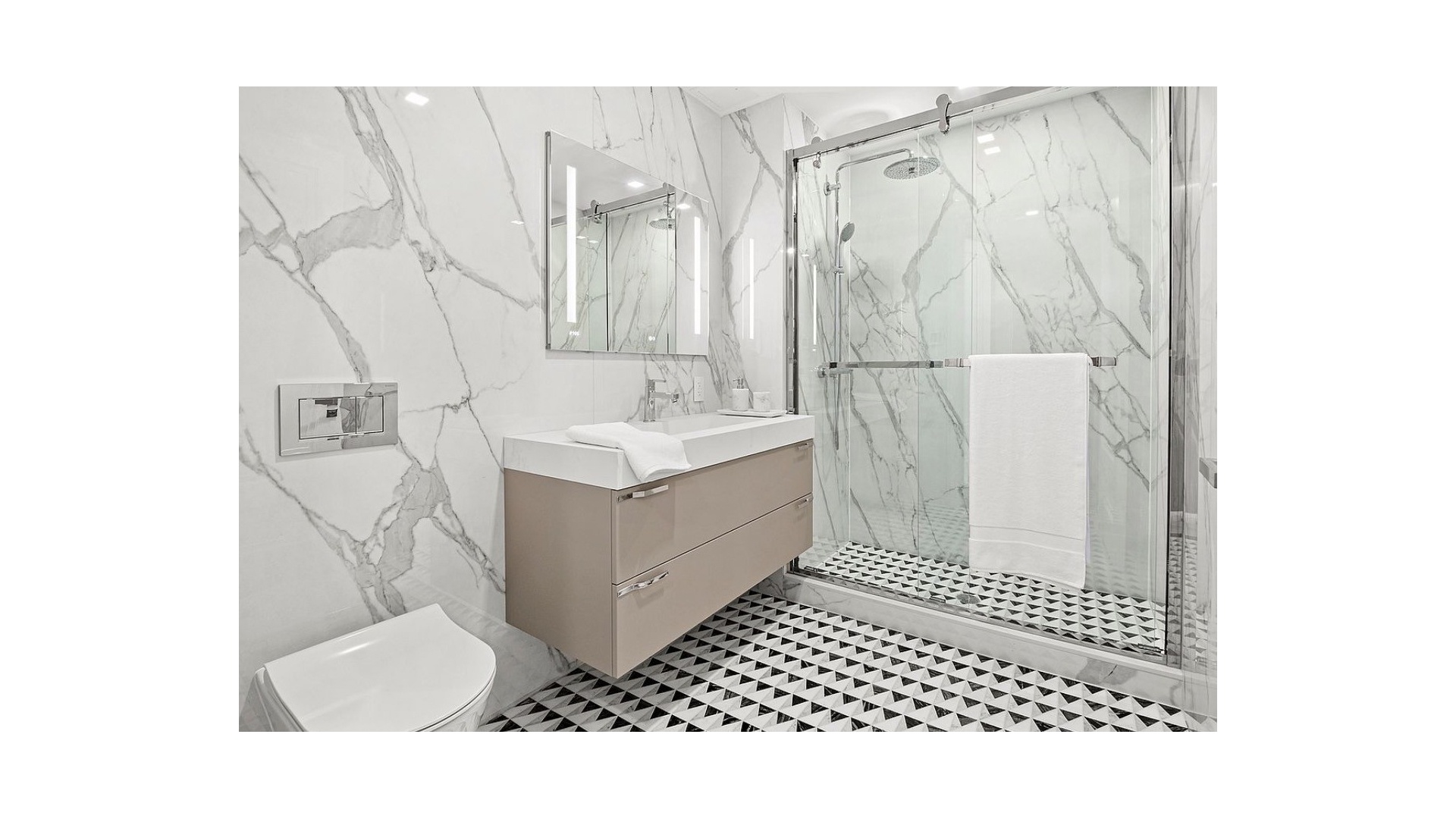 Spa-like bathrooms are comprised of 12mm thick oversized porcelain slab tiles imported from Spain, and custom cabinetry also furnished by Scavolini. Wall-mounted Gerber toilets, contemporary Grohe fixtures and imported marble floors complete the sleek design.