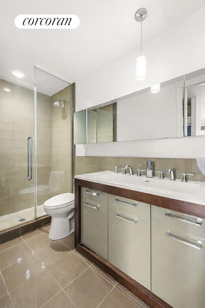 The spa-like bathroom features a deep soaking tub, custom vanity, and oversized Italian porcelain tile. The two bedrooms are generously sized, with excellent closet space and flexibility for a home office or guest room. Additional highlights include central air conditioning, a stackable washer/dryer, and abundant storage throughout.
