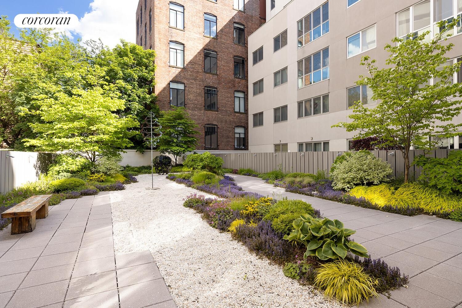 The apartment faces the building's quiet courtyard, offering a peaceful retreat from the city while maintaining exceptional light and privacy. Both the living area and kitchen open directly onto the oversized private patio, ideal for outdoor dining, lounging, or entertaining.