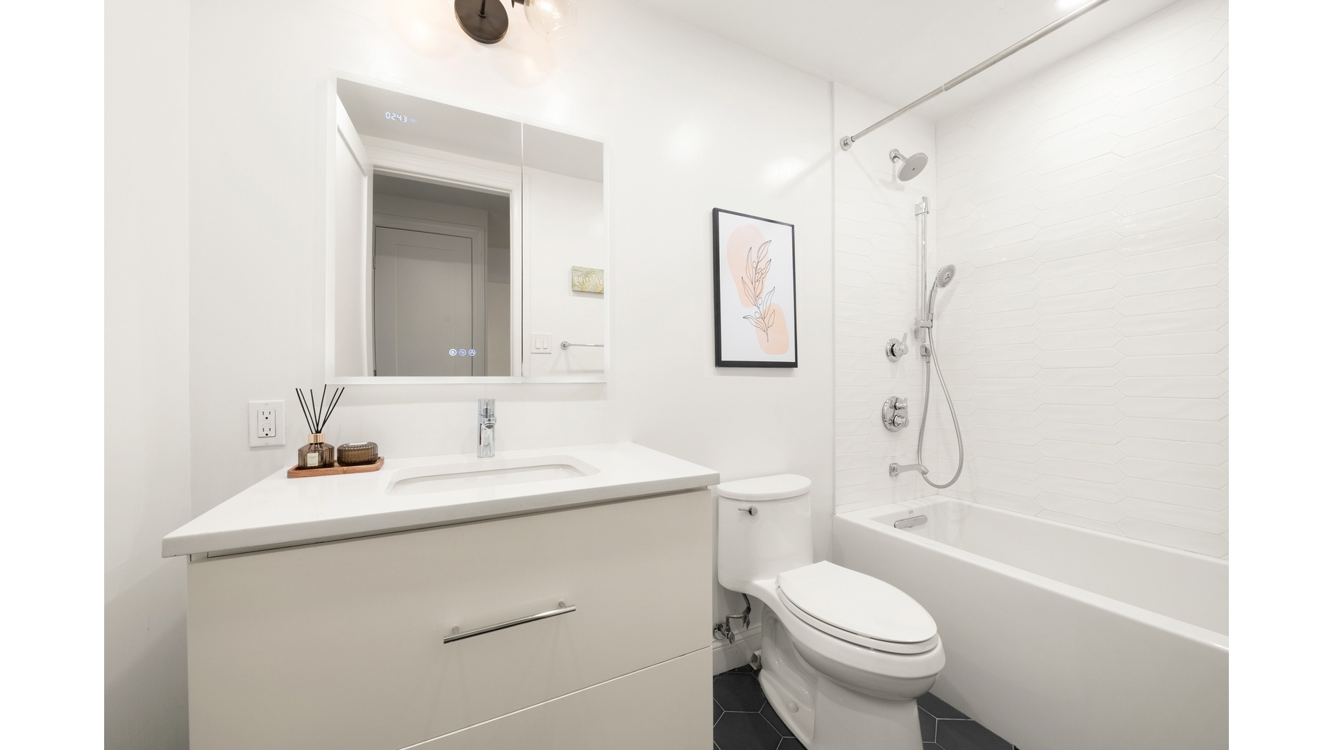 The second bedroom, which has views to the north, is almost as large as the primary bedroom and has two deep customized closets. The expertly renovated second bathroom which has been finished in a classic geometric tile has been appointed with a modern white vanity, a Blossom LED medicine cabinet, and a soaking tub.