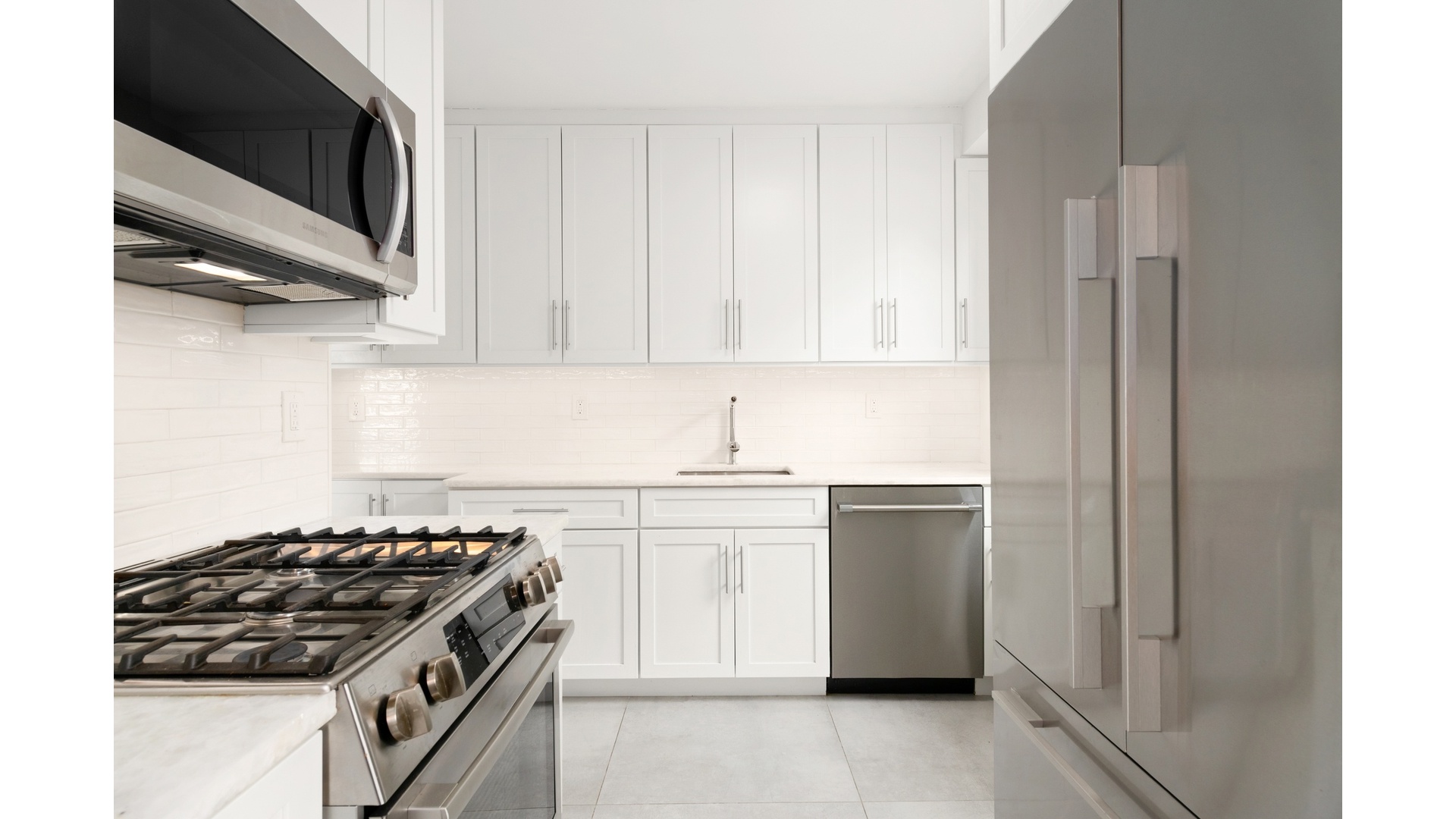 The beautifully renovated and thoughtfully designed windowed kitchen features custom white shaker-style cabinetry, designer stainless steel appliances (Fisher-Paykel French-door refrigerator, Bosch Range, Beko Dishwasher and Samsung microwave) and white quartzite countertops. Additional kitchen details include a large, custom-designed pantry, a beautiful backsplash made from hand-crafted tiles, LED undermount task lighting and large format tile floors.