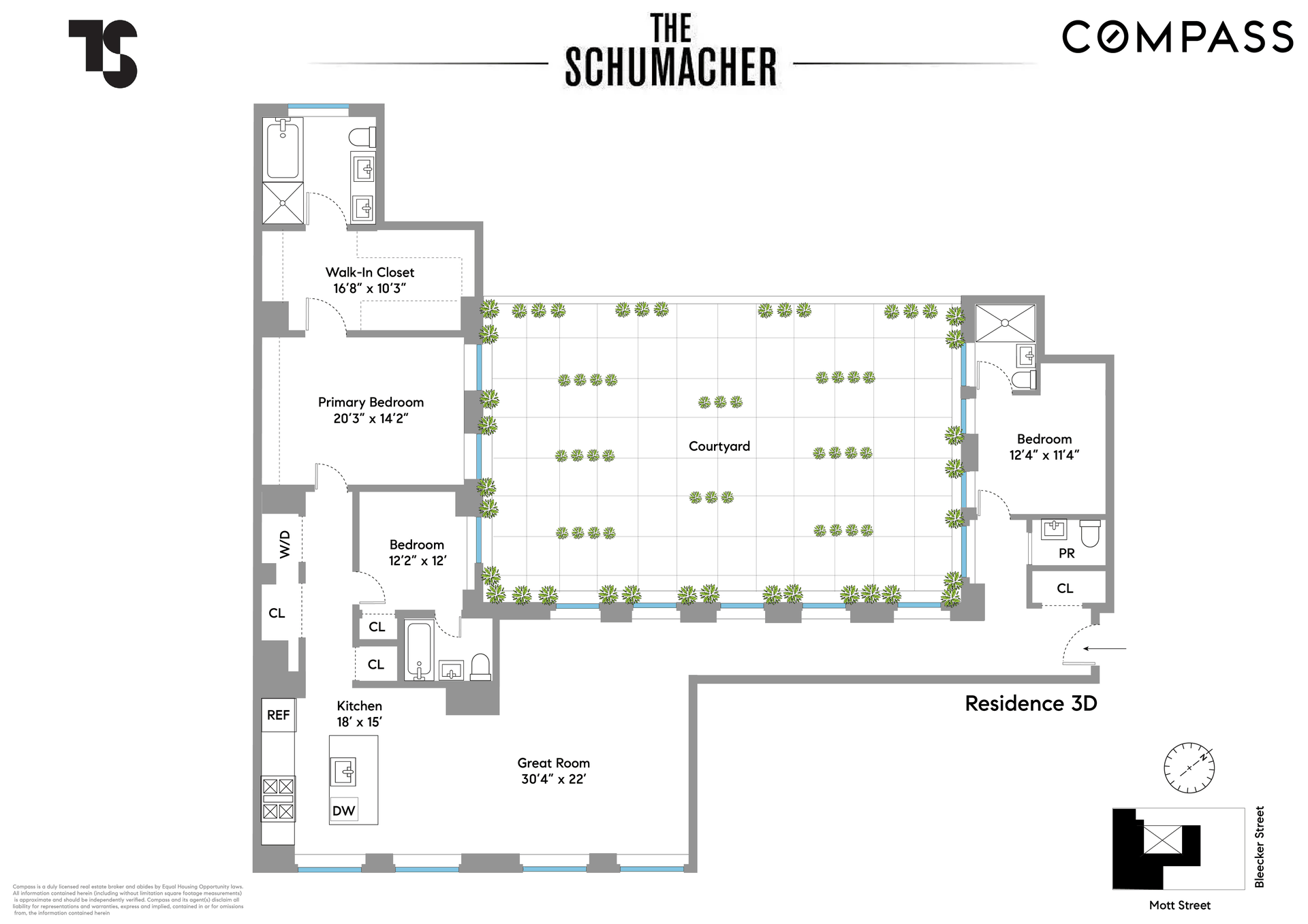 The Schumacher offers a discreet full-service living experience, including a 24-hour attended lobby, a residents’ library overlooking the interior sculpture garden, a 750-square-foot fitness center, a large children’s playroom, refrigerated storage, bicycle room, and a landscaped rooftop garden—also designed by Ken Smith—providing a rare, elevated outdoor retreat in the center of downtown Manhattan. 3D comes with a large private storage unit.