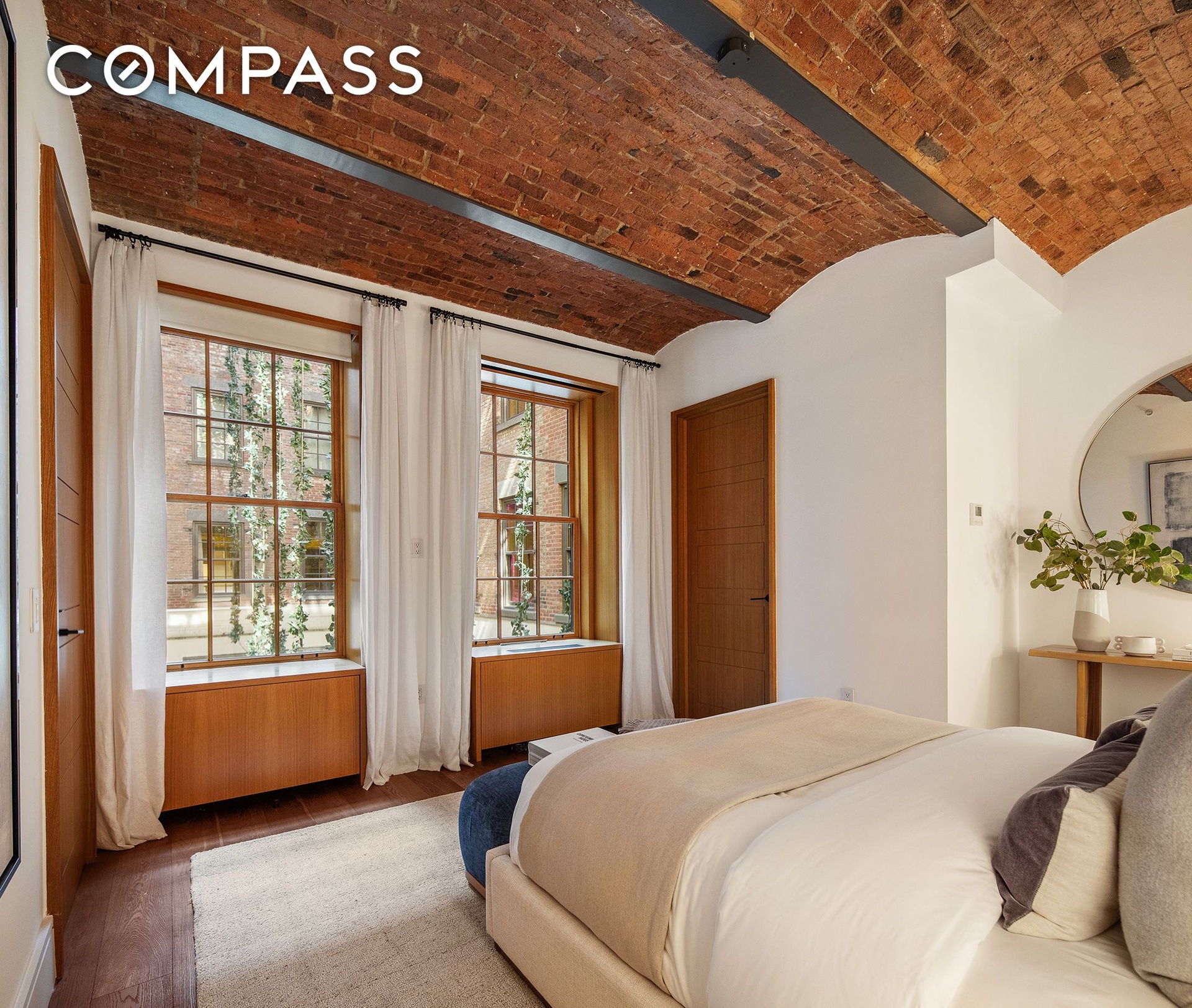 A gracious entry gallery unfolds as a 39-foot corridor of light, lined with windows overlooking the Schumacher’s lush interior garden designed by Ken Smith. This tranquil passage establishes a sense of calm and separation from the city, leading seamlessly into a voluminous great room composed for both living and entertaining. Here, multiple seating and dining zones are bathed in natural light through four deep-set, oversized arched windows with leafy outlooks over Mott Street—an intentionally framed urban landscape that brings greenery and texture into the home year-round.