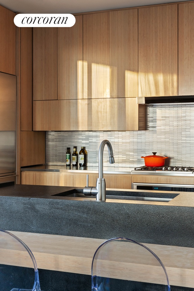 Just off the foyer is a beautifully tiled powder room with custom vanity and under-counter storage. The king-sized primary suite is a serene retreat featuring an east-facing floor-to-ceiling sitting nook, a walk-in closet, and a windowed en-suite bath with soaking tub and separate shower. Each bedroom is equipped with custom floor-to-ceiling storage and motorized shades for a clean, tailored aesthetic.