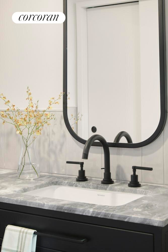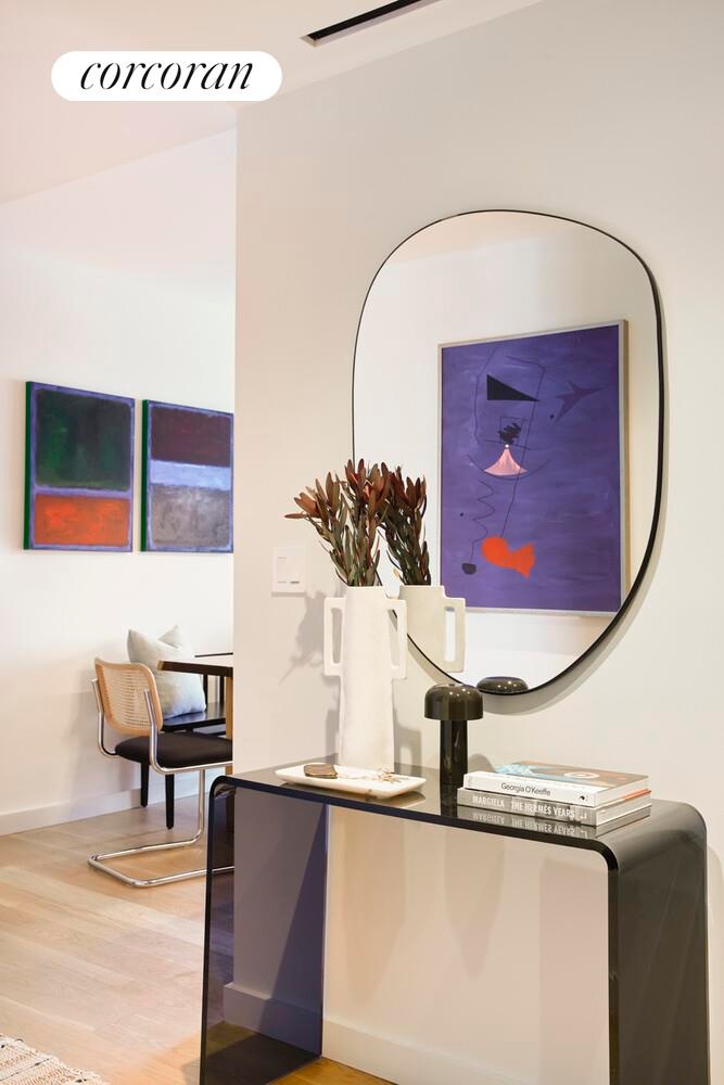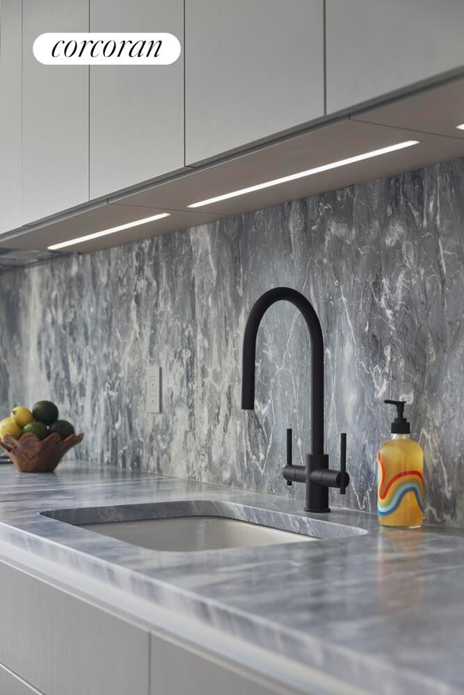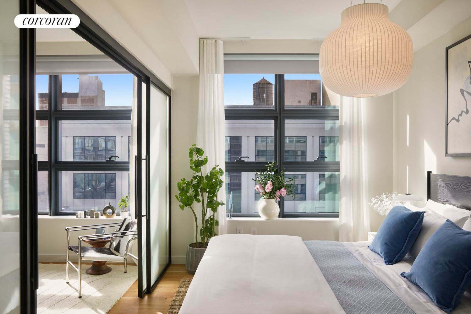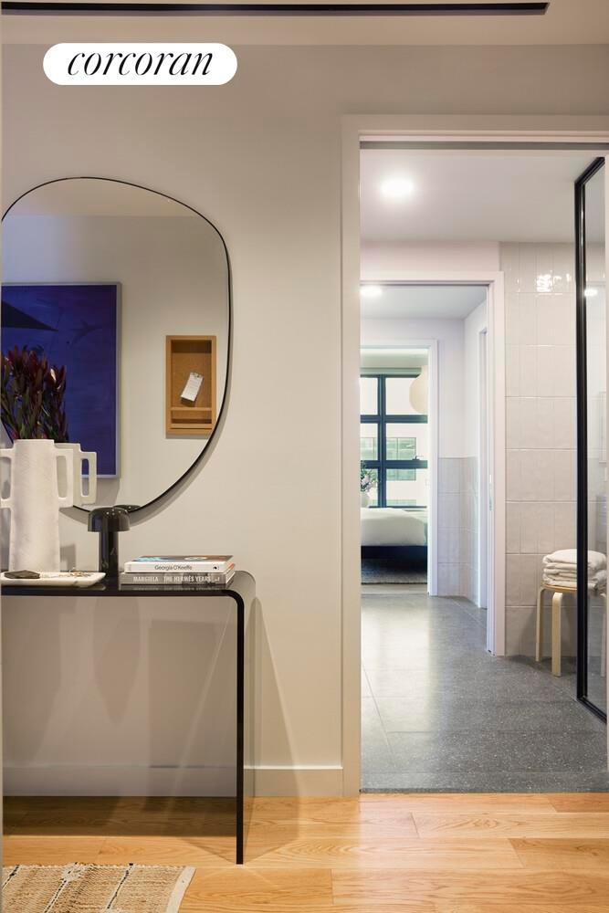 Residence 527 is a perfectly designed 675 sq. ft. 1 Bedroom residence with a North exposure, bringing excellent light into the home. The entry foyer leads to the open kitchen featuring dramatic marble countertops and backsplashes, custom cabinetry with ample storage, and appliances by Miele and Bosch. The loft-like layout of the living space leads to the primary bedroom through sliding cast-glass doors inspired by the industrial heritage of the neighborhood, and the stylishly designed en-suite bath features grey terrazzo flooring, pale grey ceramic wall tiles, honed grey marble countertop on custom matte black vanity and matte black fixtures by Rohl. Residence 527 is completed with conveniences such as an in-residence washer and dryer by Bosch, central air conditioning, motorized roller shades at windows and private storage, making these homes the perfect urban oasis.