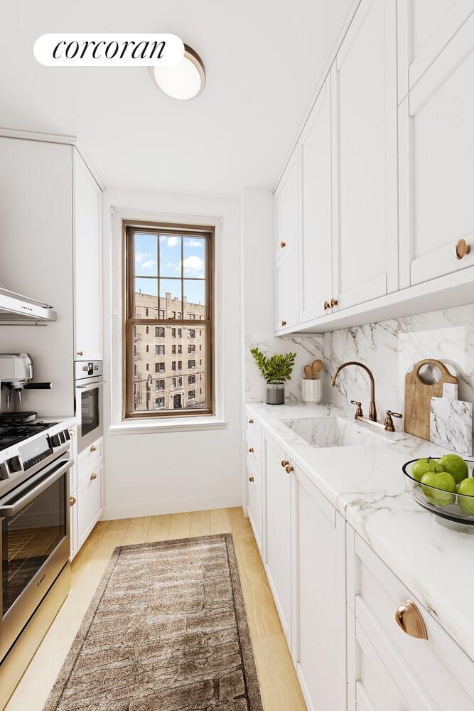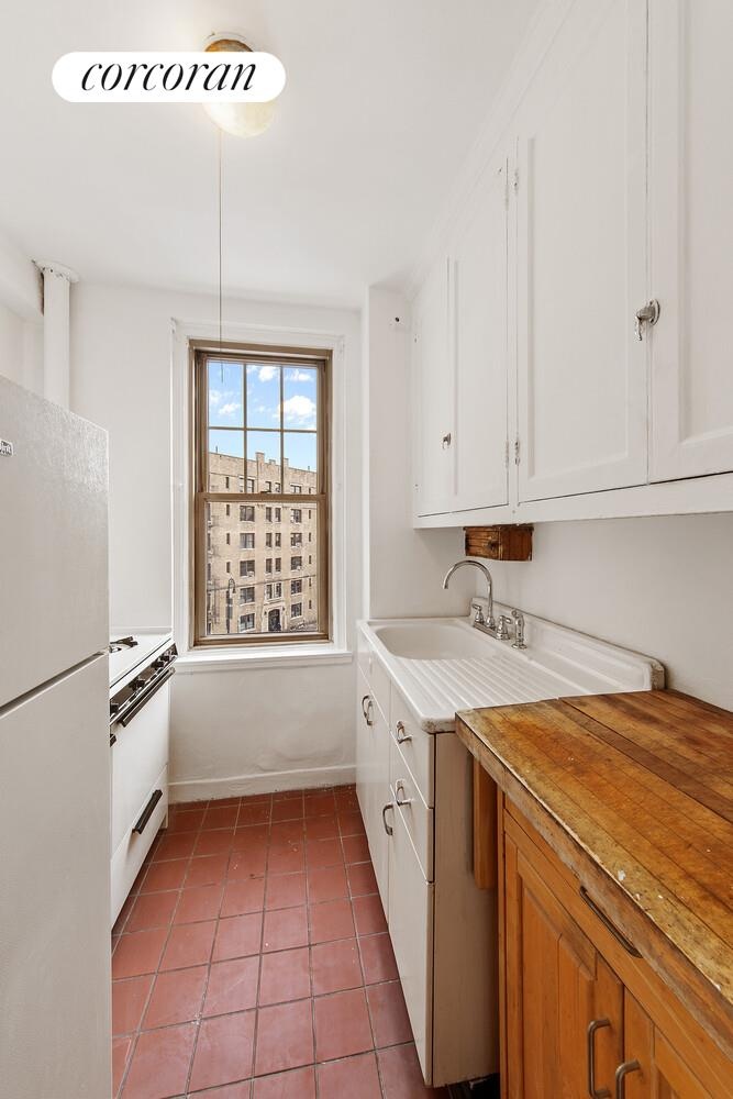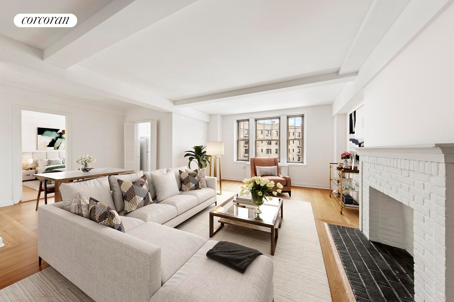 The sun-filled, sunken living room is both elegant and inviting, featuring a decorative fireplace, beautiful hardwood floors, and original architectural details. A separate dining area enhances the layout while the windowed kitchen overlooks a treetop view. Adjacent to the dining area is a unique opportunity to convert the oversized closet to accommodate a WASHER DRYER, with the hookup already in place. This exceptional offering is available as this is a sponsor unit.