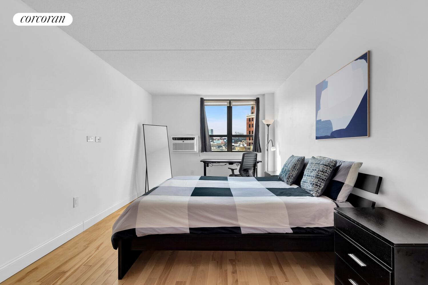 Gleaming hardwood floors run throughout a generous living and dining area designed for everyday living and easy entertaining. Double-pane windows with elegant treatments enhance comfort while framing city rooftop and sky views. The apartment is in good condition with ample closet space for practical storage.