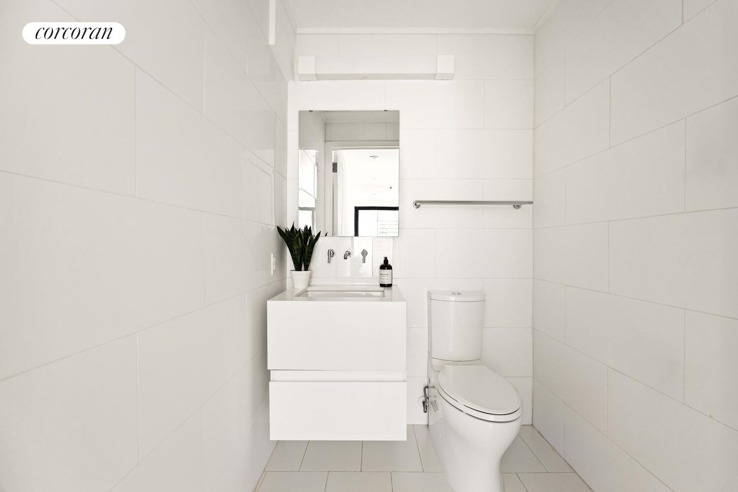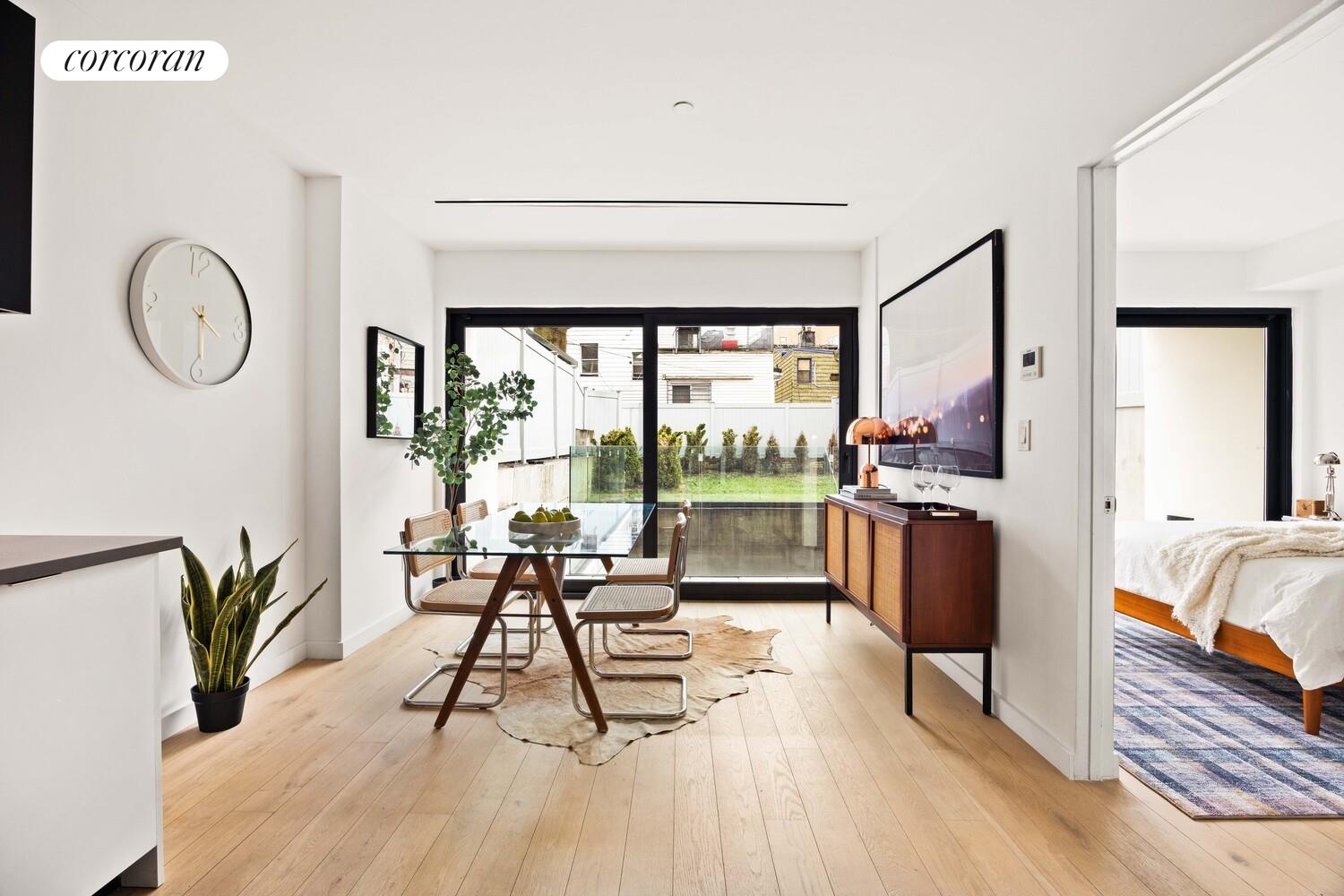 Enter into a spacious open kitchen, living and dining area punctuated with private garden views at every turn, and an easy walk out directly into your gracious and pastoral upper garden. The chef's kitchen beautifully marries black and white flat-front cabinetry with finger pulls, and a Gotham Gray honed Italian Quartz countertop and backsplash; materials as practical as they are stylish. A spacious entry closet can easily be divided into a pantry as well to accommodate all of your culinary tools and groceries should you decide to forsake the amazing restaurants right outside your door. Wide plank character-grade oak floors add a historical warmth to every room in the house. And don't miss the multi-zoned heating and cooling system to keep you comfortable all year long. Oversized double-paned Shuko windows and Nano doors at the back off both levels offer vast expanses of glass for incredible airiness, while also ensuring peace and quiet from the sounds of the city. They also provide the perfect garden access so you can experience nature even when you are indoors. It's a masterful combination that ensures maximum light with unrivaled soundproofing.