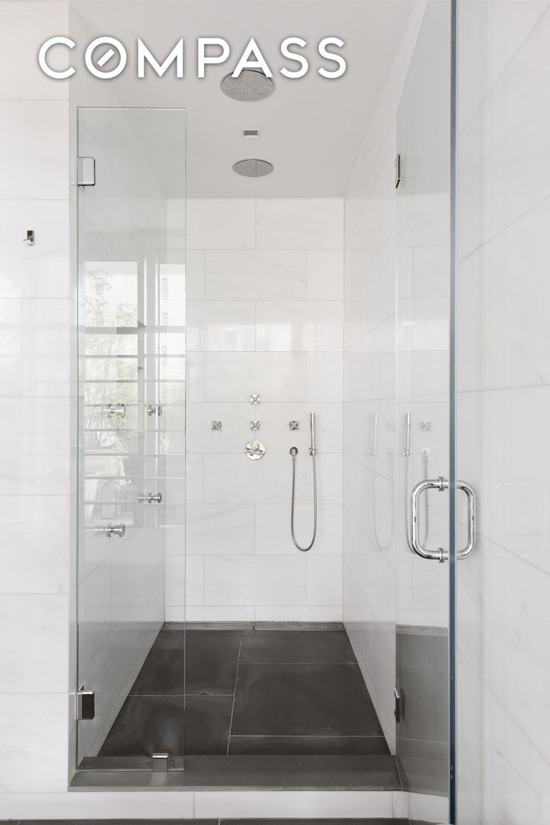 The elegant central staircase leads to the private wing, home to 4 en-suite bedrooms. The corner primary suite features a huge bedchamber with venetian plaster walls and a bleached oak wood-paneled ceiling, two spacious walk-in closets with extensive custom-fitted cabinetry, and a landscaped corner terrace looking west to Union Square. The luxurious en-suite bath is flooded with natural light from the large sliding glass wall opening onto the private terrace, and features a walk-in double rain-head shower, a freestanding soaking tub, as well as a marble and teak-clad steam room, and a double sink vanity with extensive storage. Down the hall are three additional bedrooms, each with en-suite baths as well as a generous laundry room.