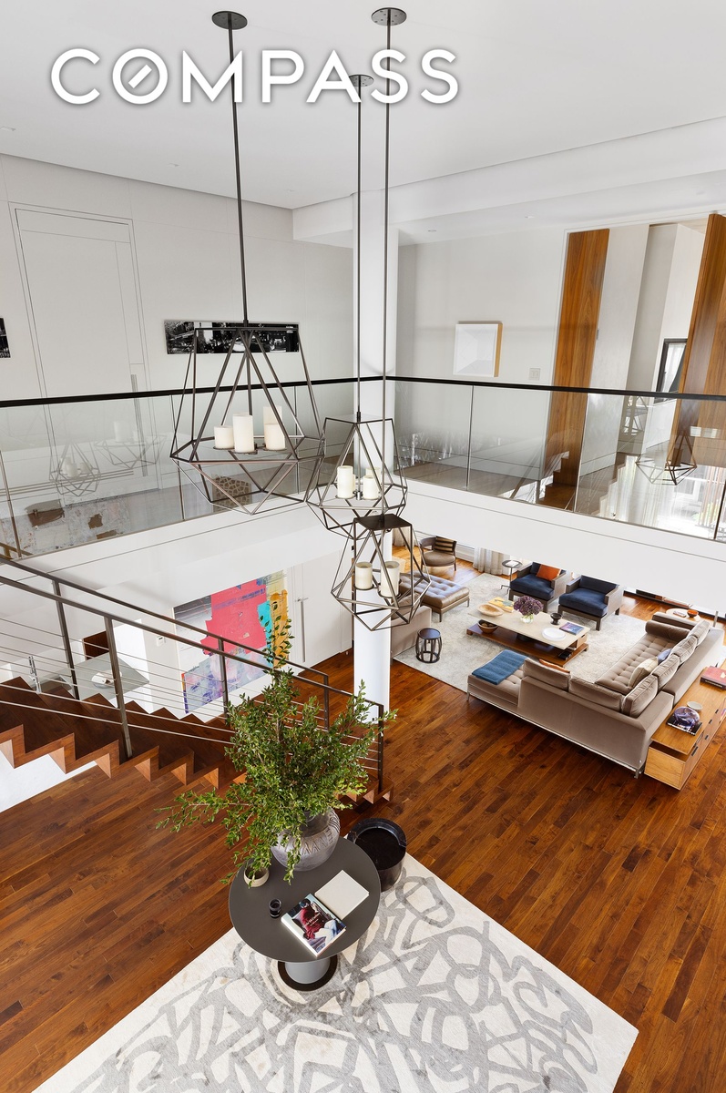 The key-locked elevator opens into a sun-flooded great room, with 100 linear feet of floor-to-ceiling windows facing east and west, framing city and sky views. A dramatic double-height entry hall is sure to impress, with nearly 20’ ceilings and an architecturally impressive floating wood and metal staircase, leading to the bedroom floor above (also serviced by the elevator). With ample space and flexibility for multiple furnishing plans, the great room easily accommodates several seating areas, including a large living room, dining area, den, and a bar/lounge or study. This spectacular entertaining floor features 10’ ceilings, a powder room, an ethanol fireplace, and wide plank wood floors. An east-facing set-back terrace spans the full 50-foot width of the great room, and has space for lounge seating and a dining area, as well as a built-in Viking grill. A smaller landscaped terrace off of the west side of the great room enjoys views of Union Square Park.