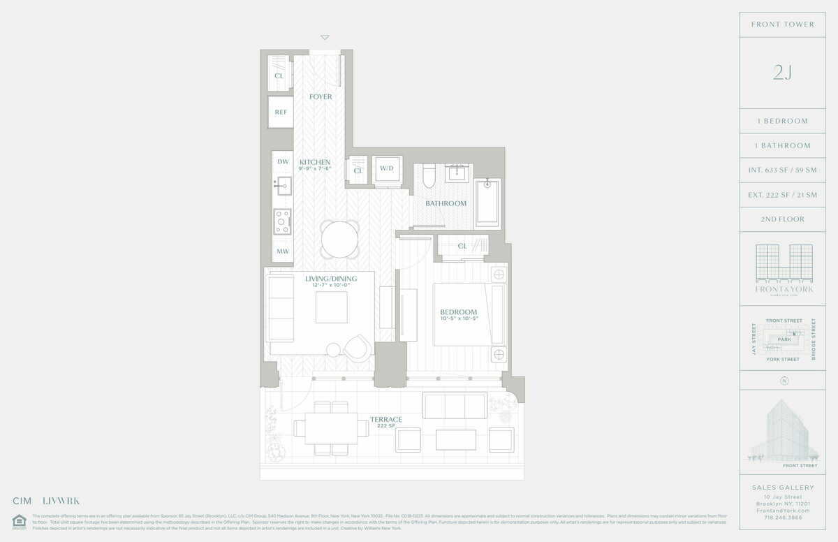 Experience the perfect blend of elegance and tranquility in this stunning residence, offering captivating views of a beautifully landscaped private park and your own expansive 222 sqft *outdoor terrace*. Residence 2J is a bright and airy one-bedroom home, thoughtfully designed with three spacious closets and oversized divided-light windows that fill the space with natural light while showcasing the park setting. Sophisticated interiors boast approximately 10-foot ceilings and chevron-patterned white oak flooring, combining style with comfort.