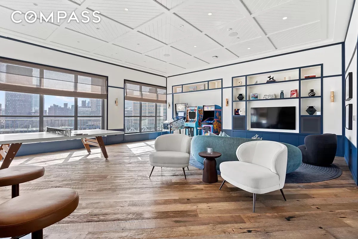 The custom chef’s kitchen is a standout feature, equipped with a full suite of state-of-the-art Gaggenau appliances. Morris Adjmi-designed white oak cabinetry in a rich tobacco finish pairs seamlessly with hand-selected Calacatta Caldia marble countertops and backsplash, creating a space that’s as functional as it is luxurious.