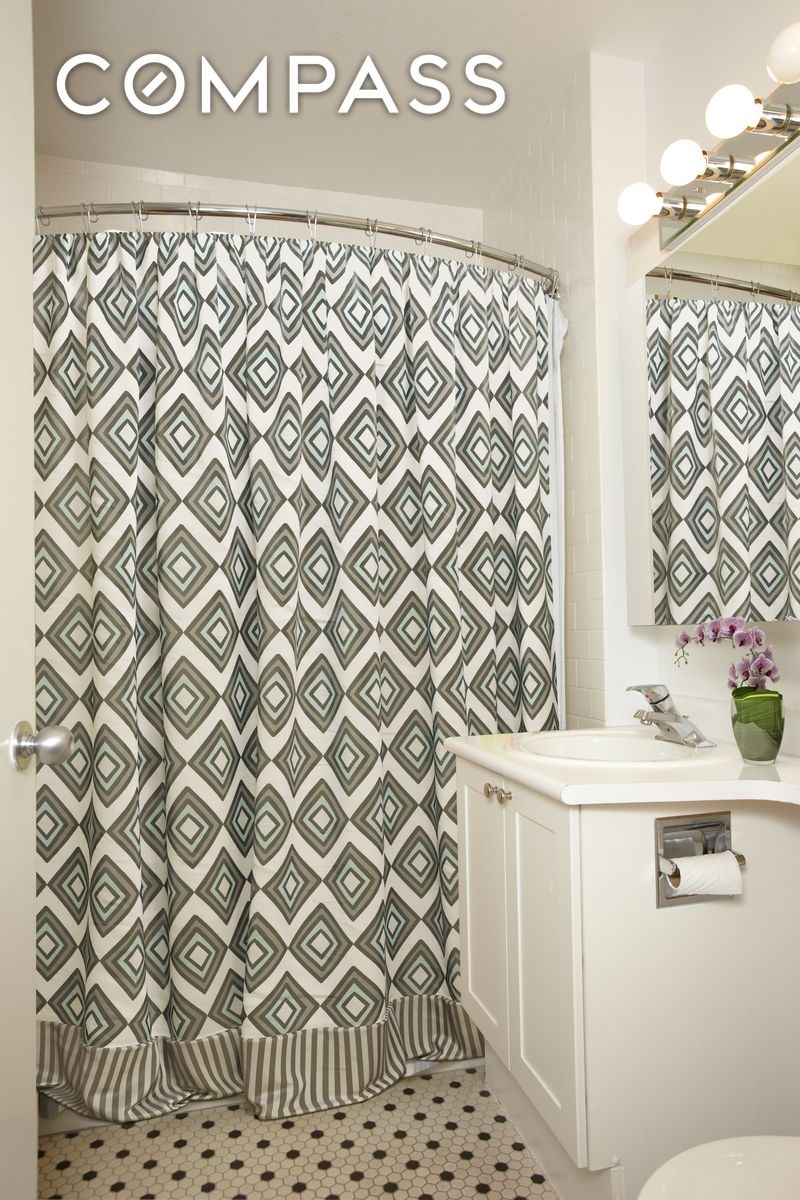 Enter through a wide gallery and pass into the dining area, home office space, and sleeping alcove (see virtually staged renderings), flanked by two banks of deep, wide closets. The roomy white-tiled bath features a classic black-and-white tiled floor.?The spacious open kitchen features white GE appliances, a white and grey tiled floor, and lots of cupboard space.?