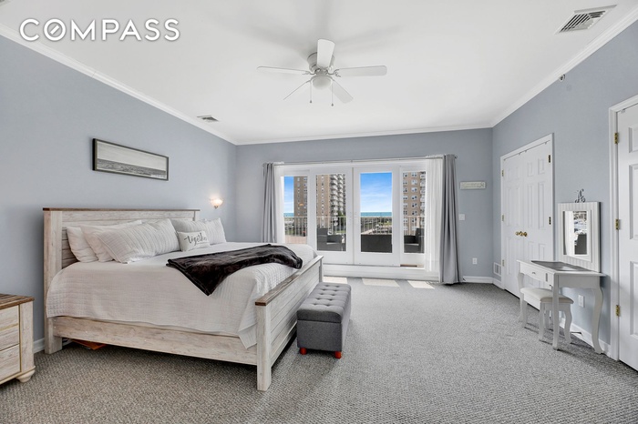 As evening falls, the gentle crashing of the waves becomes your lullaby. With the balcony doors open, the cool, salty breeze drifts in, wrapping you in a soothing embrace. The rhythmic sound of the ocean creates a serene atmosphere, helping you unwind and drift peacefully to sleep. This master suite offers an unparalleled connection to nature, promising a daily escape into tranquility.