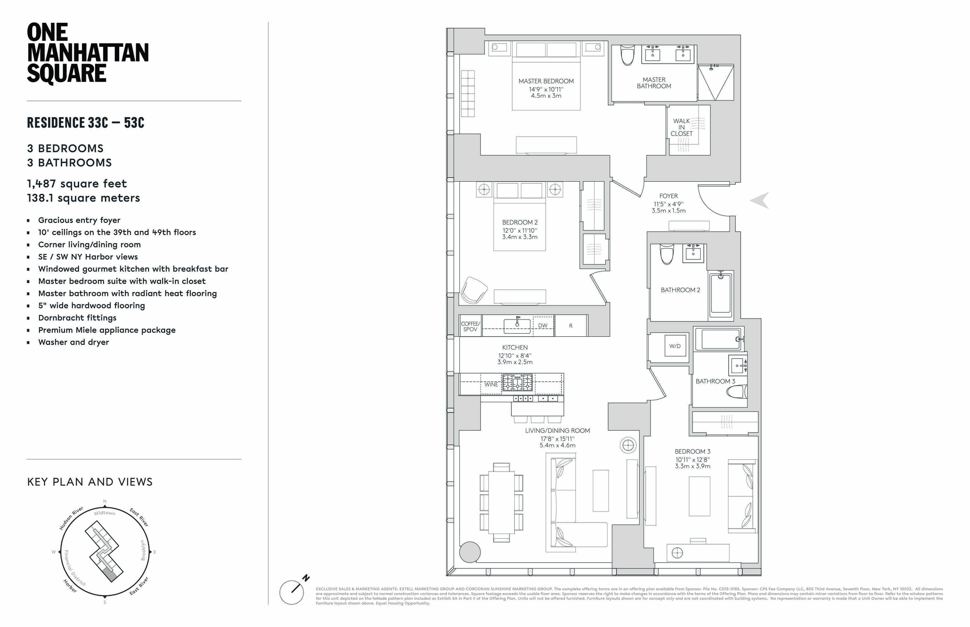ONE MANHATTAN SQUARE OFFERS ONE OF THE LAST 20-YEAR TAX ABATEMENTS AVAILABLE IN NEW YORK CITY Residence 40C is a 1,487 square foot three bedroom, three bathroom with an open gourmet kitchen and breakfast bar. This spacious corner residence faces South West and South East, with spectacular sunrise and sunset views overlooking NY Harbor, Manhattan and Brooklyn Bridges and One World Trade. Warm, modern interiors are brought to life by the renowned design team at Meyer Davis Studio. This residence features imported stone and custom finishes, premium Miele appliance package, 5" wide stained oak flooring, master bath with custom wood cabinetry, marble tile walls and mosaic floors with radiant heat, under-mount Wetstyle sink with glass vanity top and Dornbracht polished chrome faucets and a washer and dryer. New York's premier development company Extell, has collaborated with a team of world-class talent to create an icon that reflects the quality, choice and excellence that distinguish Extell properties- One Manhattan Square. Perfectly situated along the Lower East Side Waterfront, this 800-foot-tall striking glass tower offers one to three-bedroom condominium residences that feature epic river and skyline views and a lifestyle enhanced by over 100,000 square feet of indoor and outdoor amenities. One Manhattan Square presents the most valuable waterfront living opportunity in Manhattan with one of the last available 20-year tax abatement in New York City. Meyer Davis, the award-winning studio behind world-class hotels, elite private homes and flagship retail boutiques, has designed residences that rival five-star resorts. Each residence has been meticulously planned with gracious layouts, custom finishes and the most dynamic views. Residents can revel in the over 100,000 square feet of resort-like amenities that span three full floors of the tower and over 1-acre of private outdoor gardens. It all thrives on the Lower East Side. The transforming neighborhood is buzzing with energy and is within proximity of a number of landmarks including the South Street Seaport, Manhattan Bridge, and the East River Esplanade. One Manhattan Square was designed to appeal to those that want it all; iconic views, lush gardens, gorgeous homes, and an unprecedented package of services and amenities. IIMMEDIATE OCCUPANCY SERVICES AND AMENITIES INCLUDE: Private motor court 24-Hour doorman and concierge White-glove services include package delivery, refrigerated storage, dry cleaning valet, and complimentary bicycle storage. Hammam with cold plunge pool 75’ Saltwater indoor swimming pool Children’s wading pool Spa treatment rooms Hot tub Sauna Full basketball court Two-lane bowling alley Squash court Golf simulator 42 Person movie theater and performance space Cellar bar and lounge Coworking space Wine storage and tasting room Cigar room Culinary lounge and demonstration kitchen Business center Game room Indoor children’s playroom State-of-the-art weight room & cardio rooms Separate spin, yoga, Pilates and dance studios On-site parking garage available Pet spa, laundry, and alterations facilities Private storage available One Acre of Private Outdoor Amenities and Gardens include: Sumac meander Birch garden Social courtyards and relaxation lawns Fire pits Outdoor grills and dining Herb garden Treehouse Children’s playground Tea pavilion Outdoor ping-pong Putting green Stargazing observatory 93’ Covered dog run Managed by Extell Management Services