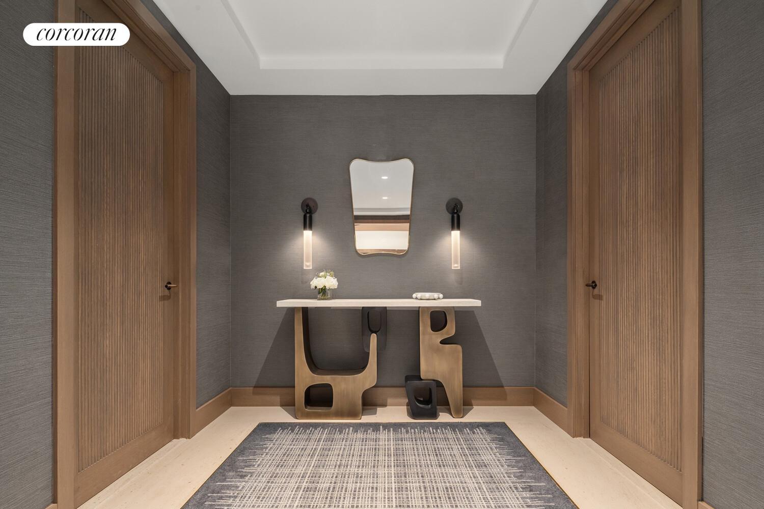 Residence 5J boasts a custom Italian kitchen by Boffi featuring a hand selected honed Namibia Rose marble countertop and backsplash, white oak cabinetry, fluted, reflective bronze upper doors and Waterworks polished chrome hardware. Professional-grade appliances include Sub-Zero refrigerator, Wolf range, Wolf speed oven, wine fridge, and Cove dishwasher. No expense has been spared.