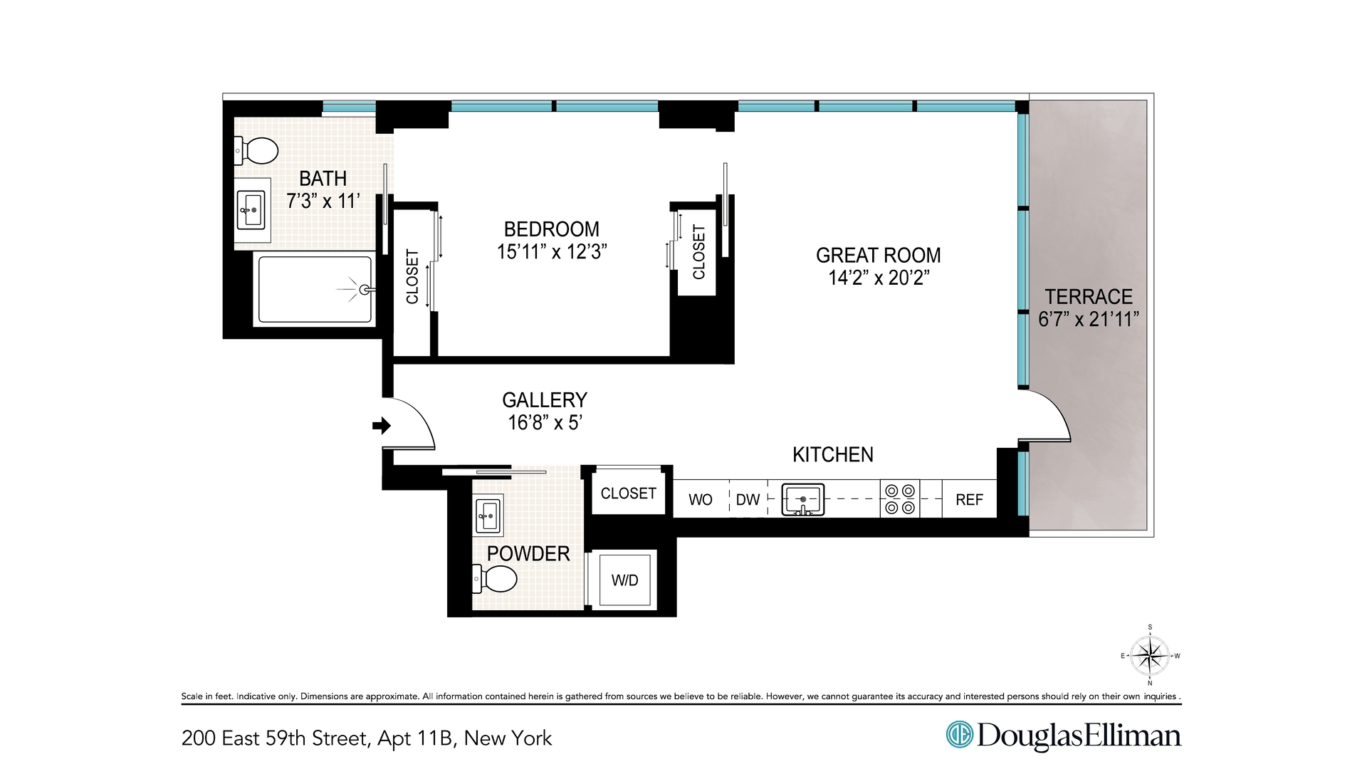 This outstanding 835 square foot one bedroom, one and a half bath light filled corner residence features 22 linear feet of terrace space with exposures to the south and west.