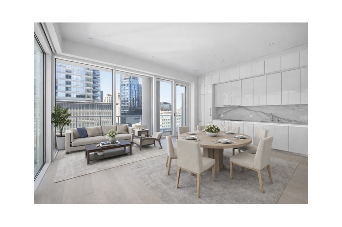 This outstanding 835 square foot one-bedroom, one and a half bath light-filled corner residence features 22 linear feet of terrace space with exposures to the south and west. The floor-to-ceiling glass windows and expansive 10' ceilings tie the inside/out living concept together perfectly. The 144 square foot terrace seamlessly connects the great room to an open kitchen outfitted with Italian white glass and aluminum trim cabinetry by Aran Cuchine, book matched honed Calacatta marble slab countertops, full-height backsplashes, and integrated Brilliant White glass appliances by Miele including an integrated wine refrigerator.