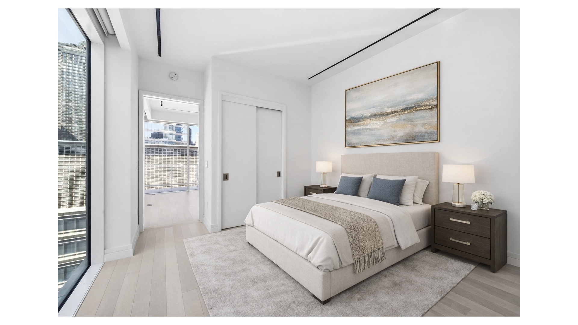 The gracious south facing primary bedroom features two ample closets and a luxurious en-suite primary bath clad with Siberian white polished marble walls and honed marble floors with radiant heating. A floating vanity is crafted from Siberian mink polished marble, fixtures by Watermark's contemporary Loft 24 Collection in a polished chrome finish, and a spa-like floor-to-ceiling glass enclosed rain shower with thermostatic controls. Wall-mounted toilets are by Toto.
