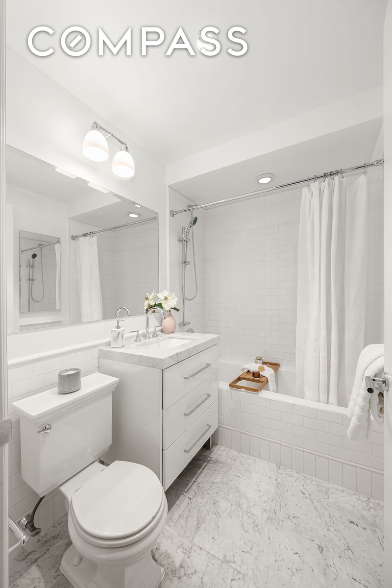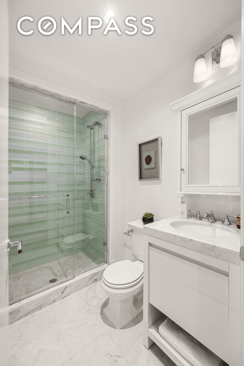 Additional highlights include central air conditioning, an in-unit washer and dryer, and two large private storage units included with the sale, an exceptional convenience rarely found in Manhattan.