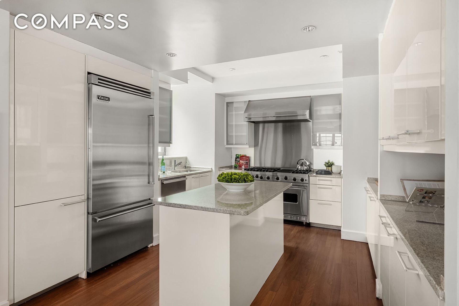 The windowed chef’s kitchen is beautifully appointed with top-tier appliances, including an six-burner Viking range with griddle, Viking refrigerator, and Miele dishwasher. A substantial center island provides generous prep space and a pantry provides abundant storage, seamlessly integrating function and style within the home’s open, loft-like design.
