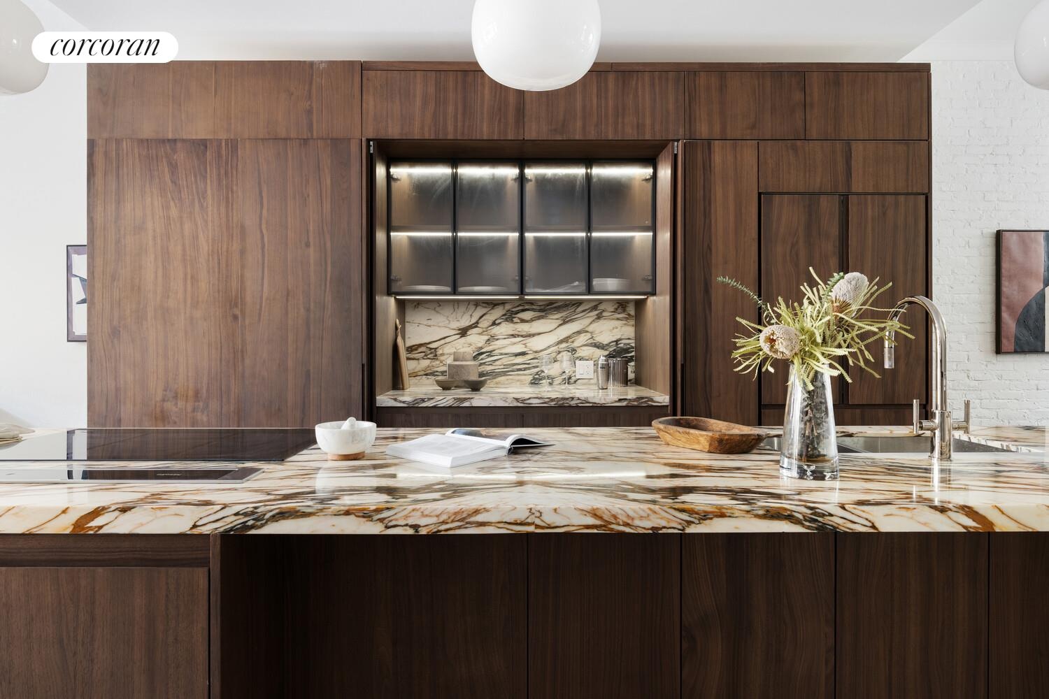 Custom fluted walnut cabinetry and integrated pantries introduce depth and warmth to the clean architectural lines. Thoughtfully integrated into the millwork, the appliance package is entirely Miele: induction range, exterior-vented hood, walnut paneled refrigerator and dishwasher, and a discreet microwave drawer.