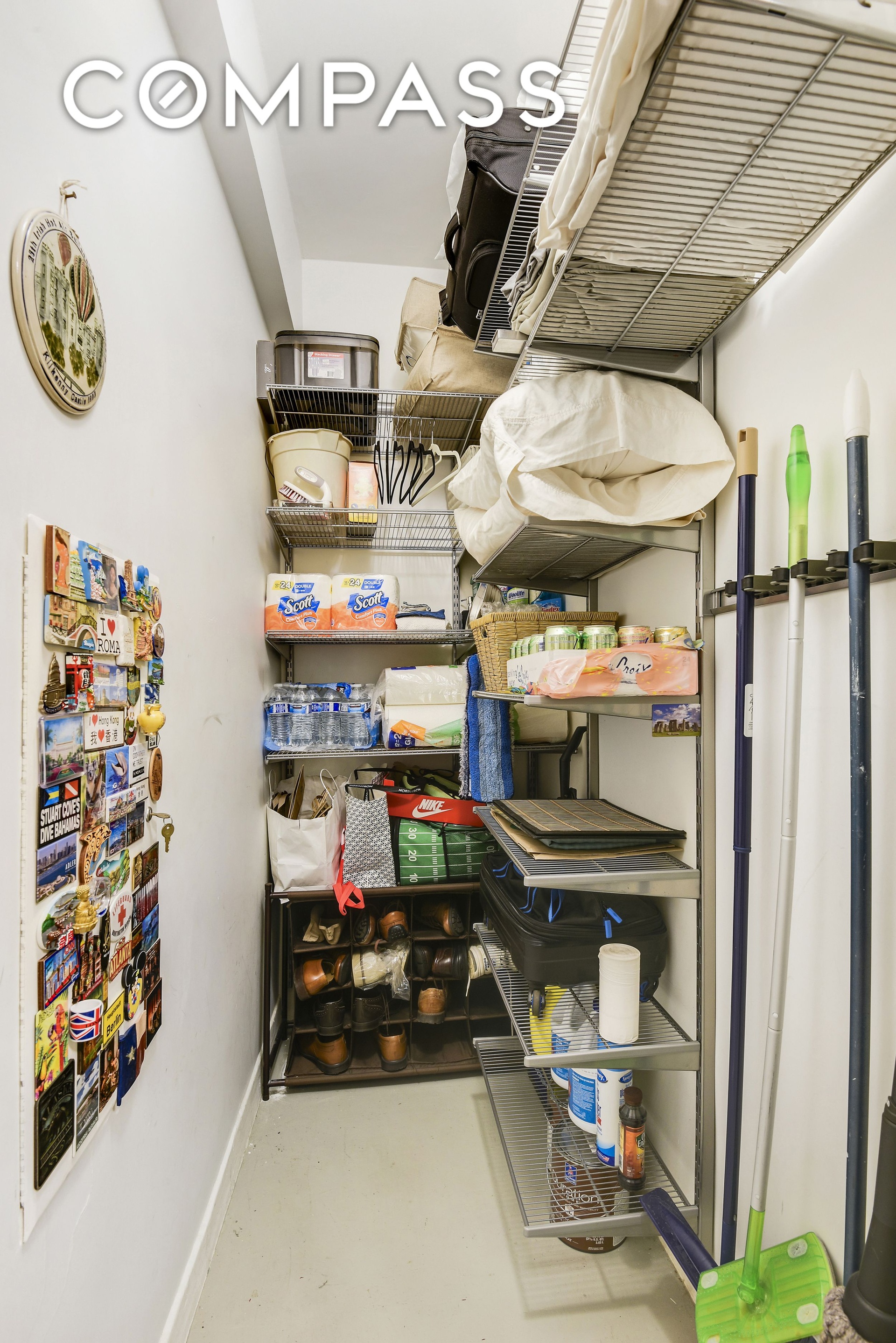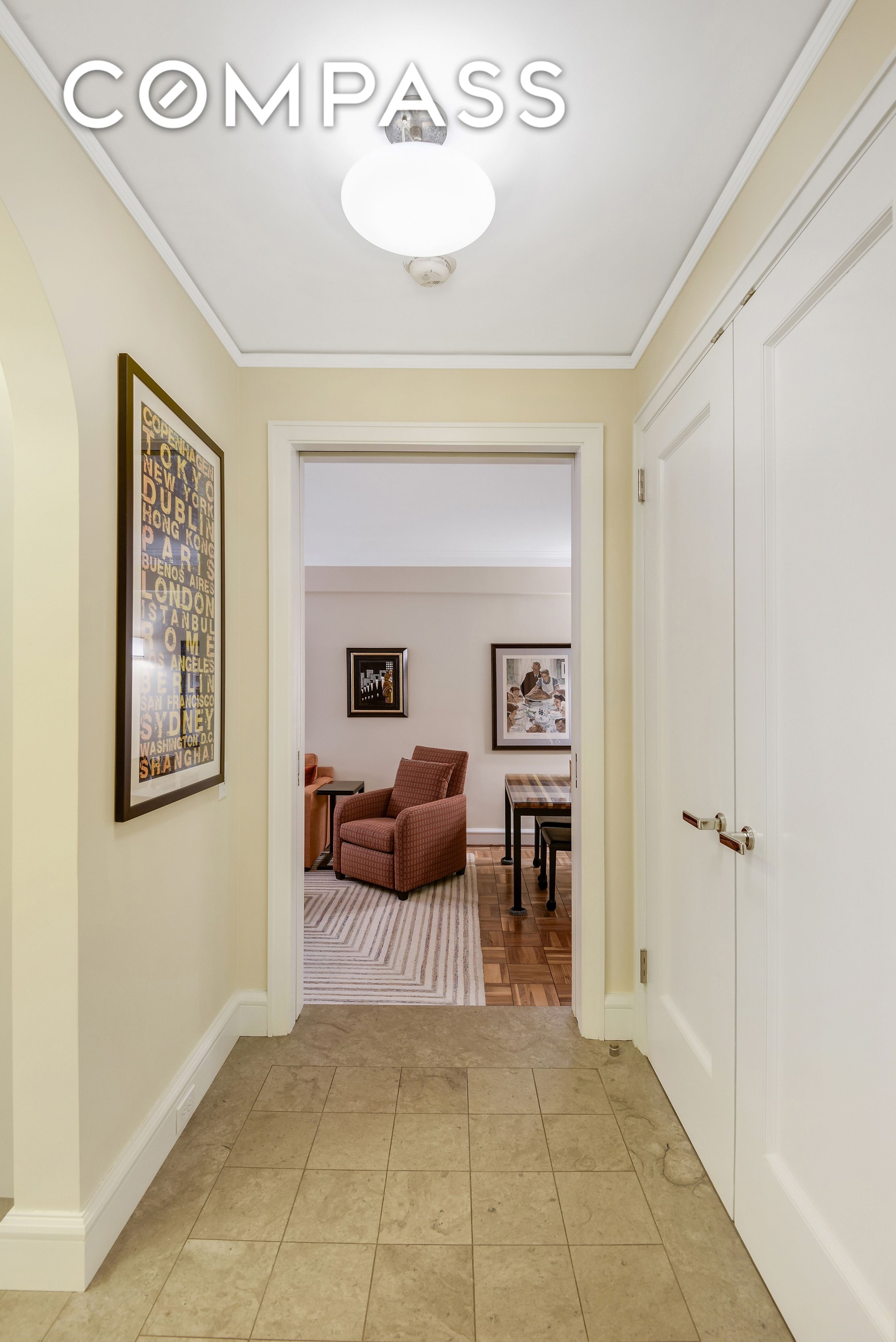 Pocket doors lead to a hallway and dressing area with generous closet space, including a dedicated closet housing a washer and dryer. The corner bedroom is generously proportioned and enjoys south and east exposures with serene garden views and excellent natural light. The windowed bathroom features heated mosaic tile floors, Lefroy Brooks fixtures, and abundant cabinetry for storage.