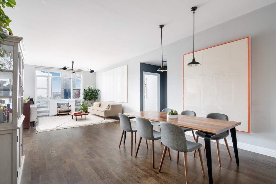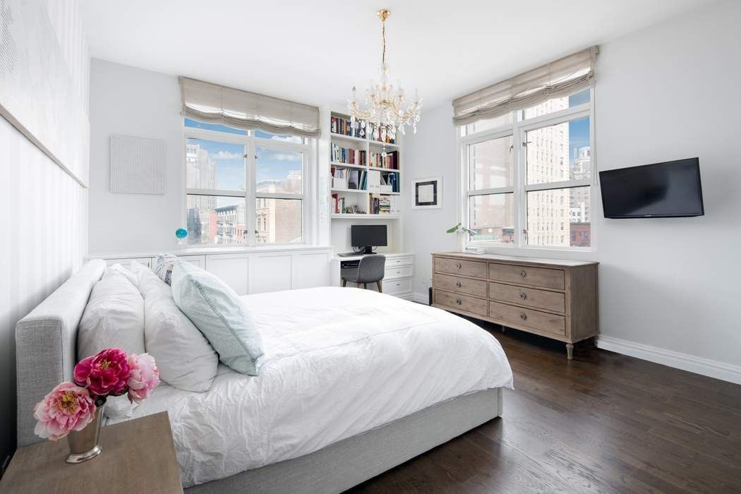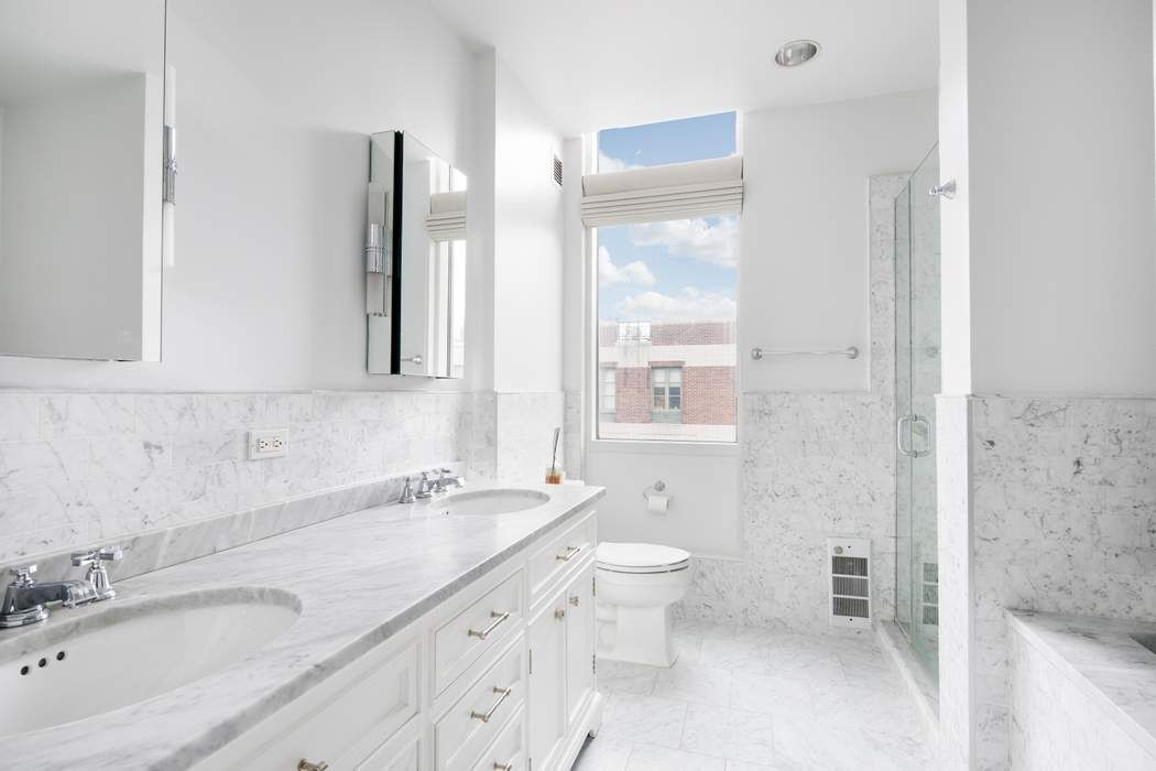 Away from the living area, the over-sized private primary suite enjoys partial views of the Empire State Building and it makes for the perfect retreat for relaxation. The master bath is outfitted with Grohe fixtures, a deep soaking tub, and floor-to-ceiling stone tiling. The double vanity and glass enclosed shower allow two or more people to easily share the space. The apartment features two more very generous sized bedrooms and bathrooms. The high 10’ ceilings and expansive west facing windows throughout this beautiful home exudes warmth, air, and light to every room.
