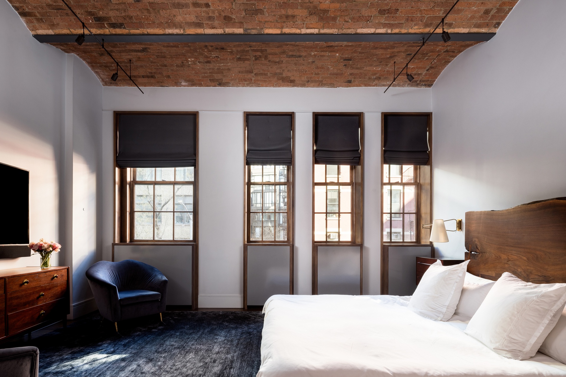 Under an iconic barrel-vault brick ceiling and boasting a stunning ensuite bathroom with a large marble-encased double vanity, an oversized dual rain shower, and state-of-the-art fixtures including a Toto toilet, as well as an oversized walk-in closet, the palatial bedroom suite is an enclave unto itself.