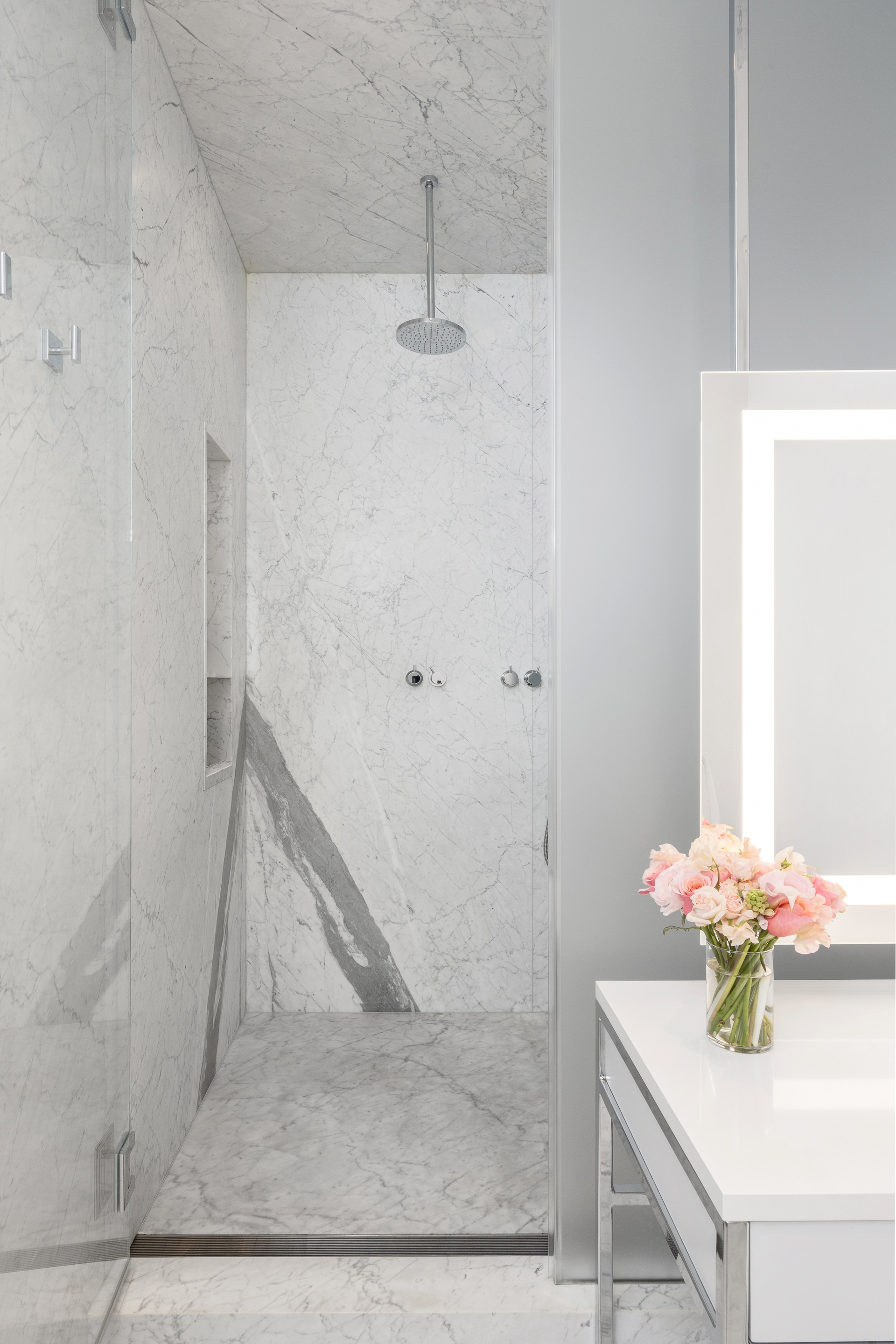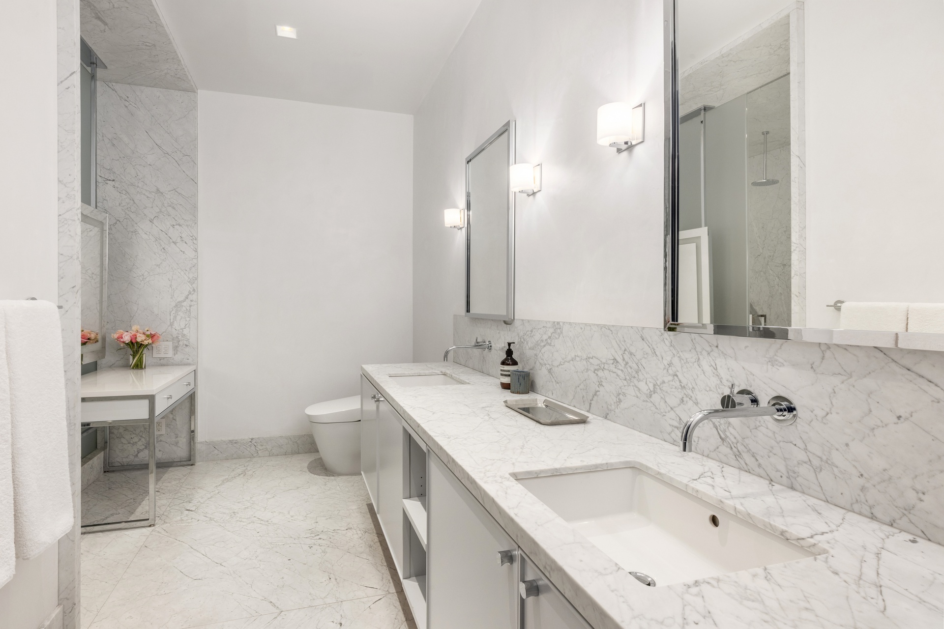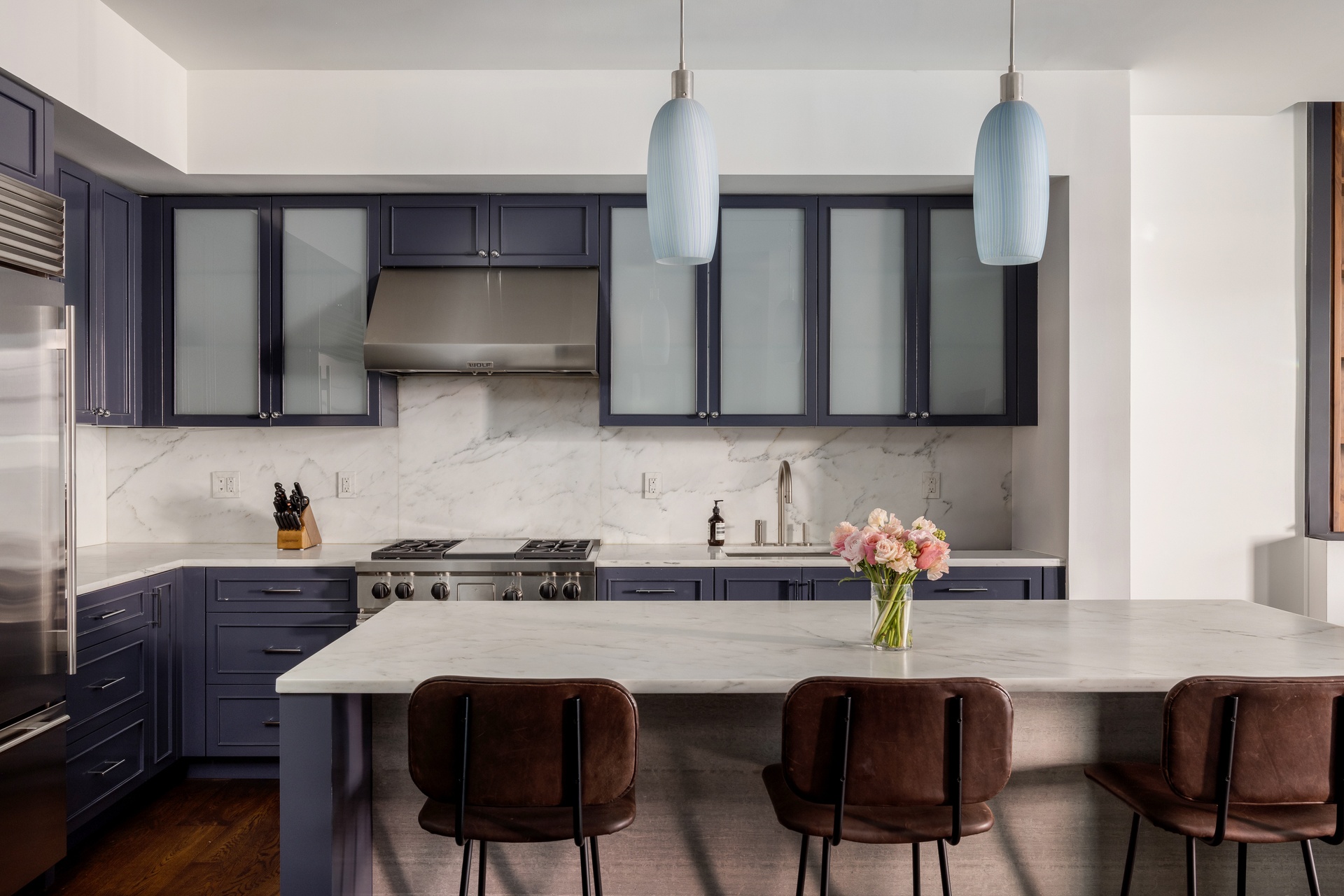 Adjacent to the great room, the chef’s kitchen features a suite of top-of-the-line appliances by Wolf and Sub-Zero, a Calacatta marble waterfall island with breakfast bar seating, and custom glass-paneled cabinetry. A full bathroom, a separate discreetly placed powder room, an expansive laundry closet with Whirlpool W/D and a large coat closet round out the entertaining space.