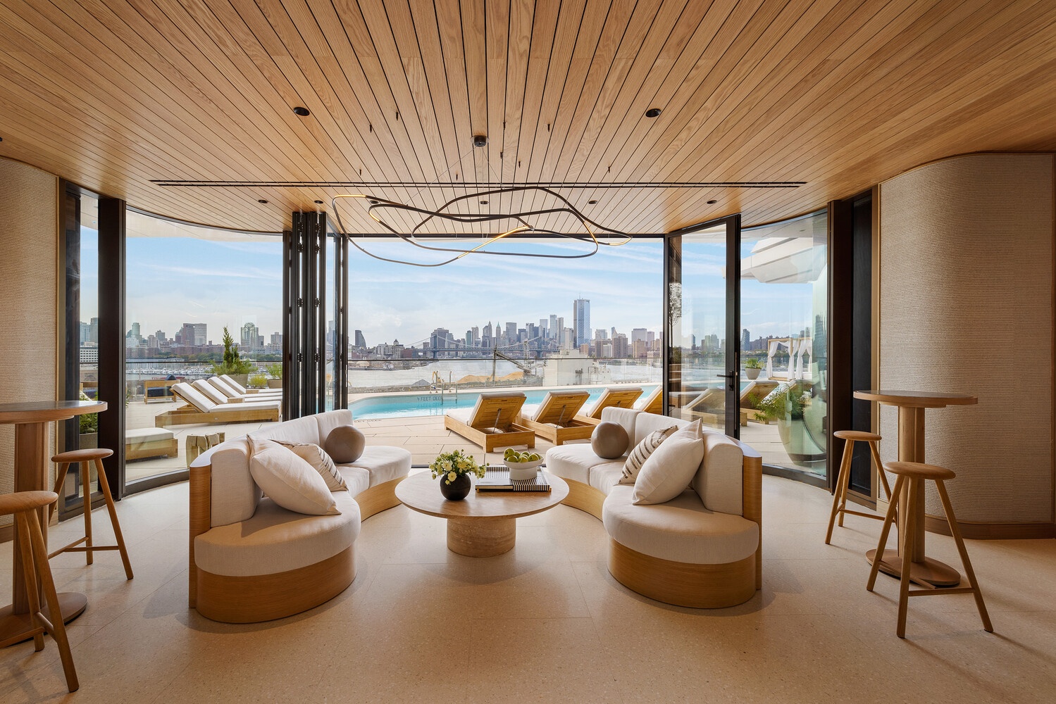 The Williamsburg Wharf Resort and Recreation Club boasts its own concierge and reception area, a multi-season rooftop escape overlooking the East River and Manhattan, several indoor-outdoor lounges, and a 60-foot pool with poolside cabanas. There is also a seasonal ice-skating rink, a game room, and state-of-the-art fitness facilities that include a fully equipped gym, yoga and stretching areas, a basketball court, and private changing rooms and lockers.