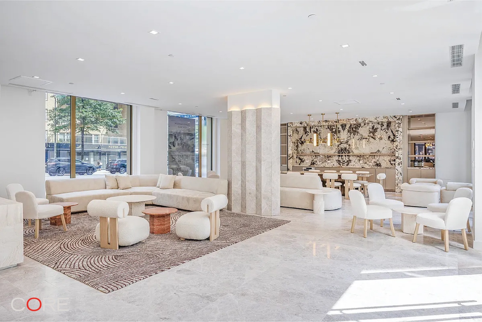Enter Residence 9A, a spacious and airy two-bedroom sanctuary filled with natural light pouring through floor-to-ceiling oversized windows. The open kitchen is a culinary masterpiece, featuring pristine marble countertops, a striking backsplash, and an island complemented by sleek white lacquer cabinets. Integrated high-end appliances, including a Thermador refrigerator and Bosch dishwasher, ensure a seamless cooking experience. Every residence is thoughtfully equipped with central air conditioning, an in-unit washer and dryer, and a smart entry lock for your convenience.