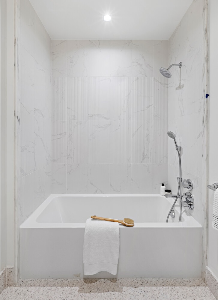 Beyond the dedicated elevator entry and formal foyer is the expansive corner great room with ceiling heights up to 10 feet and floor-to-ceiling windows clad in white oak. The adjacent private terrace provides the perfect opportunity for outdoor entertaining. The centerpiece of the great room is the spectacular kitchen, featuring custom-stained wood and Ghiaccio grey lacquer cabinetry with bevel detailing, hand-selected European high-honed Volakas marble countertops and backsplash, and a best-in-class suite of Miele appliances. An oversized closet in the private primary bedroom offers ample storage, while in the en-suite five-fixture primary bathroom features a striking backlit fluted wall, a custom dual-sink vanity with Italian Lymra countertops, and polished chrome fixtures. Heated floors and a frameless shower glass enclosure round out this spa-like bath.