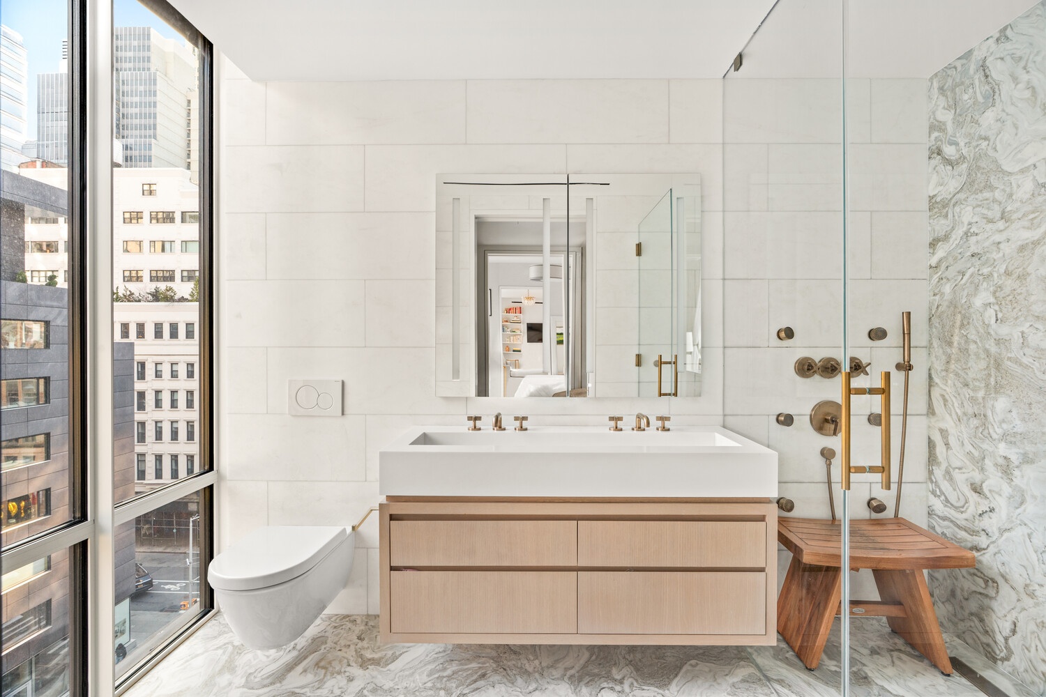 The East-facing primary suite is tucked away for privacy and a tranquil retreat with a walk-in closet and a spa-inspired, windowed en-suite bathroom. The bath is finished in honed Burlesque Bianco marble and features a custom walnut double vanity, a large walk-in shower, and radiant heated floors. The second bedroom, positioned along the northern exposure, enjoys floor to ceiling windows and is conveniently located near the second full bathroom. A vented LG washer/dryer and linen storage are discreetly located within the residence and a private storage cage will transfer with the sale of the apartment.