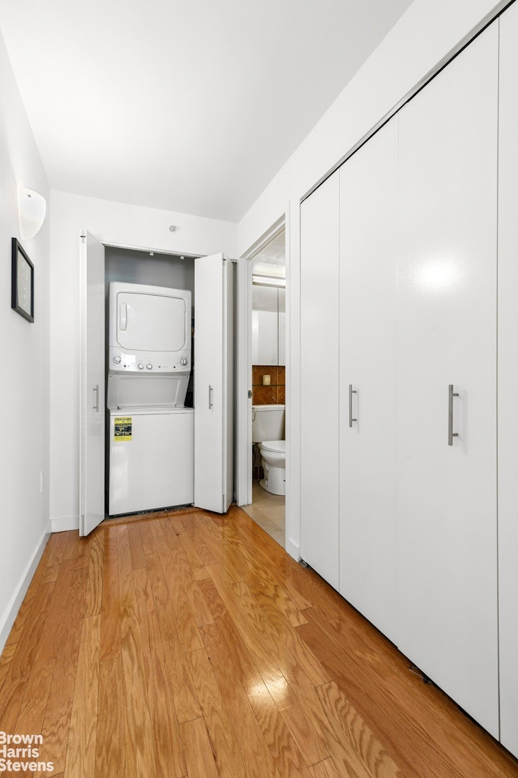 The king-sized bedroom provides a quiet retreat, offering ample room to relax and recharge. Additional highlights include a walk-in closet, in-unit washer and dryer, wood flooring throughout, and a well-appointed spa-like bathroom with modern finishes.