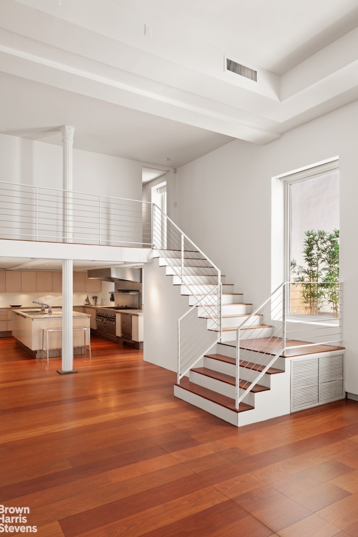 Dual entrances lead to a magnificent Living/Dining expanse with 14-foot ceilings, gorgeous wide-plank floors and bright exposures through enormous double-glazed windows. Endless wall space provides the perfect backdrop for a significant art collection, while the sheer scale and proportion of the room exudes a sense of peace and tranquility. The large, fully equipped chef's kitchen with center-island is set back from the Great Room and is designed for one who loves to cook and entertain with its deep granite countertops, abundant custom cabinetry and vast array of professional grade appliances. Nearby, a dramatic staircase leads up to the private mezzanine level featuring a spacious primary suite and cozy guest quarters.