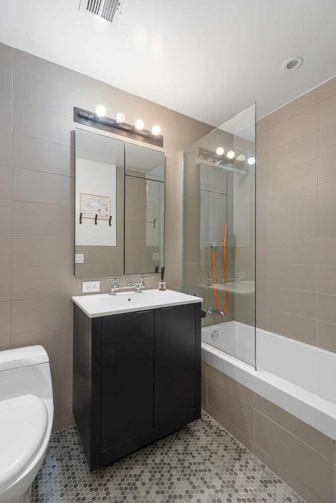 The primary bedroom comfortably accommodates a king-size bed and features a large walk-in closet and an ensuite bathroom with a deep soaking tub, and a separate shower. The second bedroom fits a queen-size bed and can also accommodate a desk. Both bathrooms are spacious and thoughtfully finished.