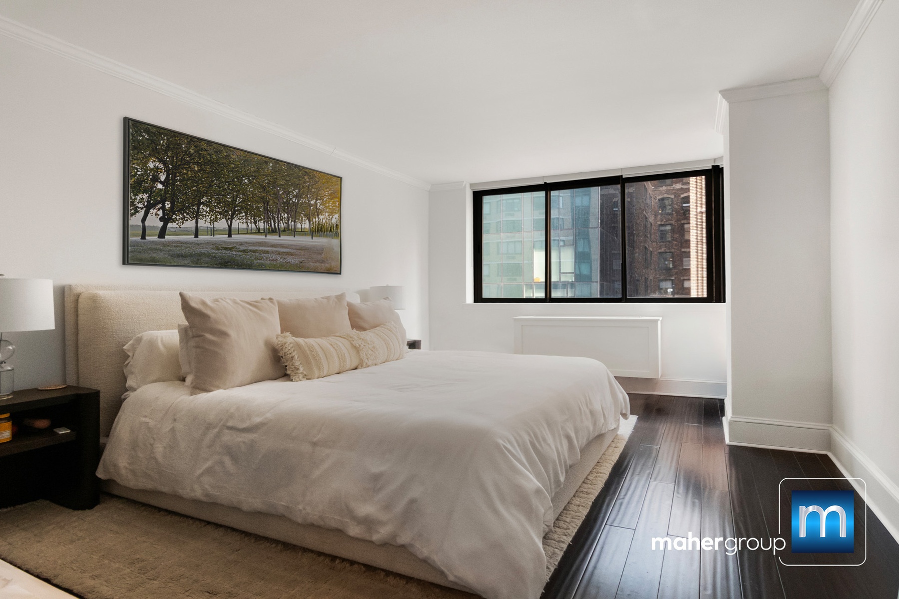 The living space is flooded with indirect natural light from double exposures and framed by iconic landmark views that preserve open skies over Park Avenue South. Custom perimeter recessed lighting, contemporary-classic moldings, “floating” PTAC enclosures, built-in shelving, and 5” solid bamboo floors complete the space. An impressive 18 feet of custom-fitted closets provide exceptional storage.