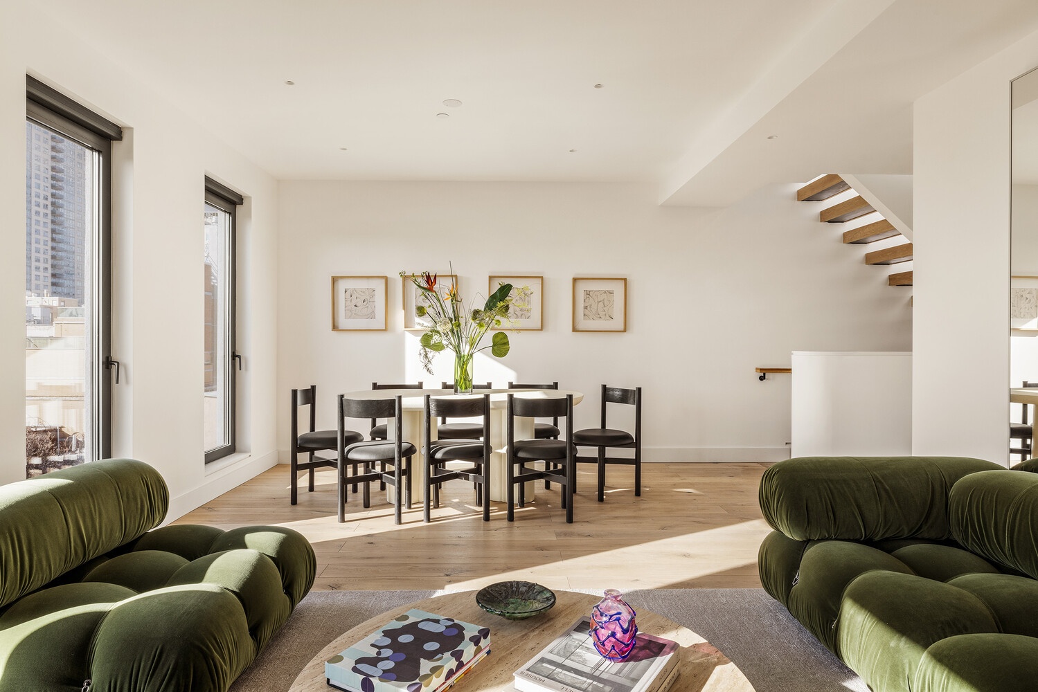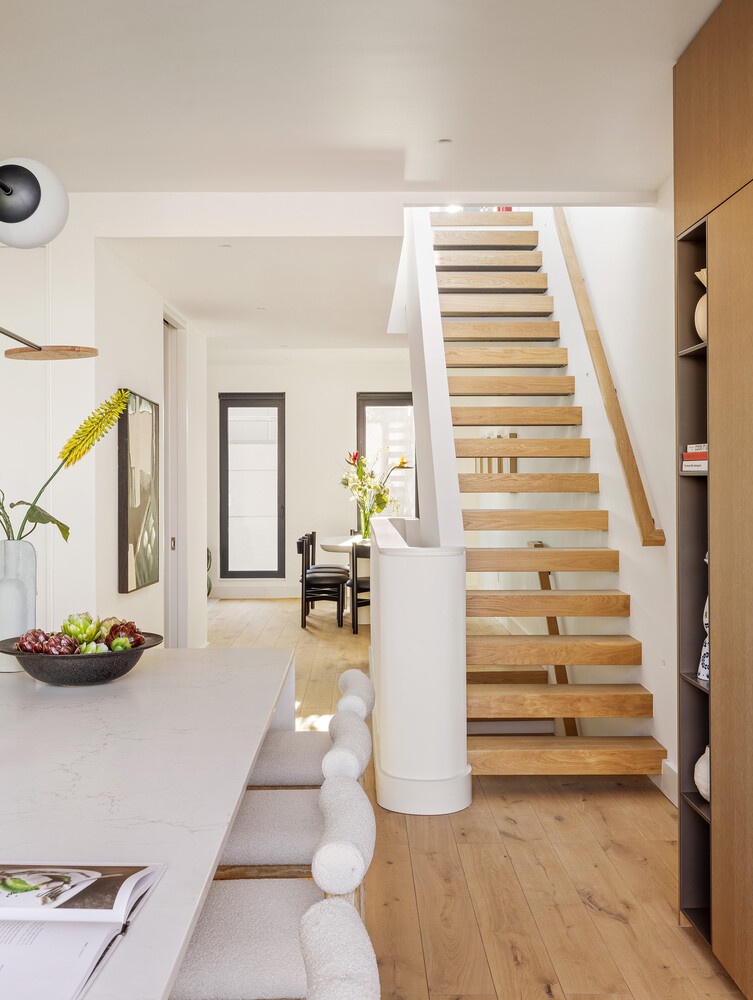 The main level flows into an expansive living and dining area framed by oversized windows that welcome tree-top views and abundant natural light throughout the day. A powder room clad in Fireclay Hunter Green tile and marble sink adds an elevated design statement. Expansive sliding glass doors disappears / collapses to a front-facing terrace equipped with a DCS BBQ-ideal for hosting celebrations for your inner circle's greatest life miles tones or the place where you slip to when the weather sets into a comfortable pace and quiet moments outside are the only item on a Saturday afternoon's itinerary.