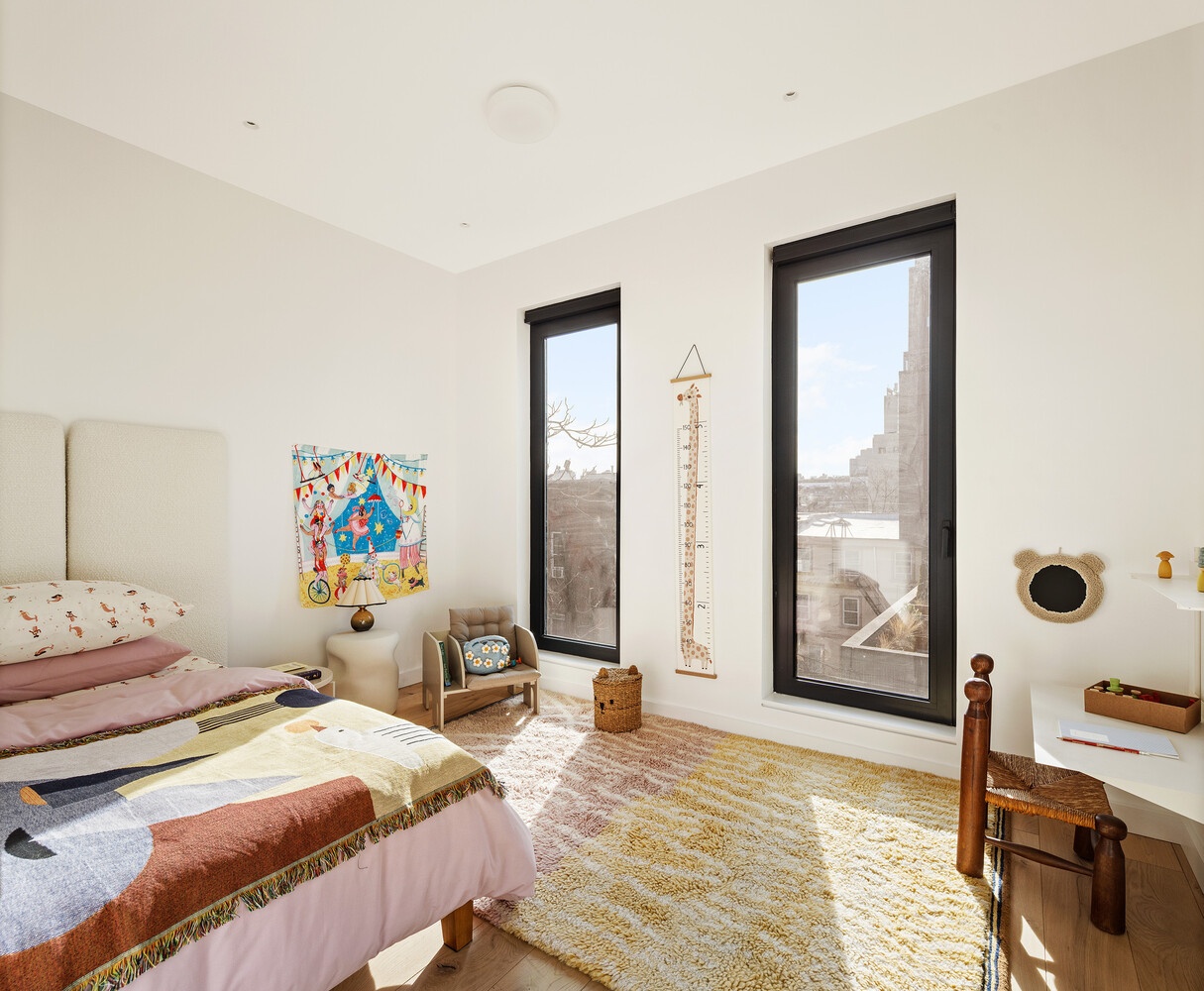 The 4th floor (first level of the home) is dedicated to private rooms, with four serene bedrooms designed for comfort and can also double as home offices, guest rooms, or the arts and crafts room you've been dreaming of but never had the space to bring to life. The primary suite features a generous walk-in closet, and a spa-quality bath (with dual showerheads) clad in Clé black slate, complete with marble sinks and a tranquil, textural aesthetic. Two additional bathrooms are finished in Porcelanosa Avenue Grey textured porcelain tile, offering a sleek and modern contrast. A versatile den provides flexible space for a media room, home office, or playroom, while an oversized in-unit washer and gas dryer adds everyday convenience. Two bedrooms can easily be combined for a larger bedroom if desired .