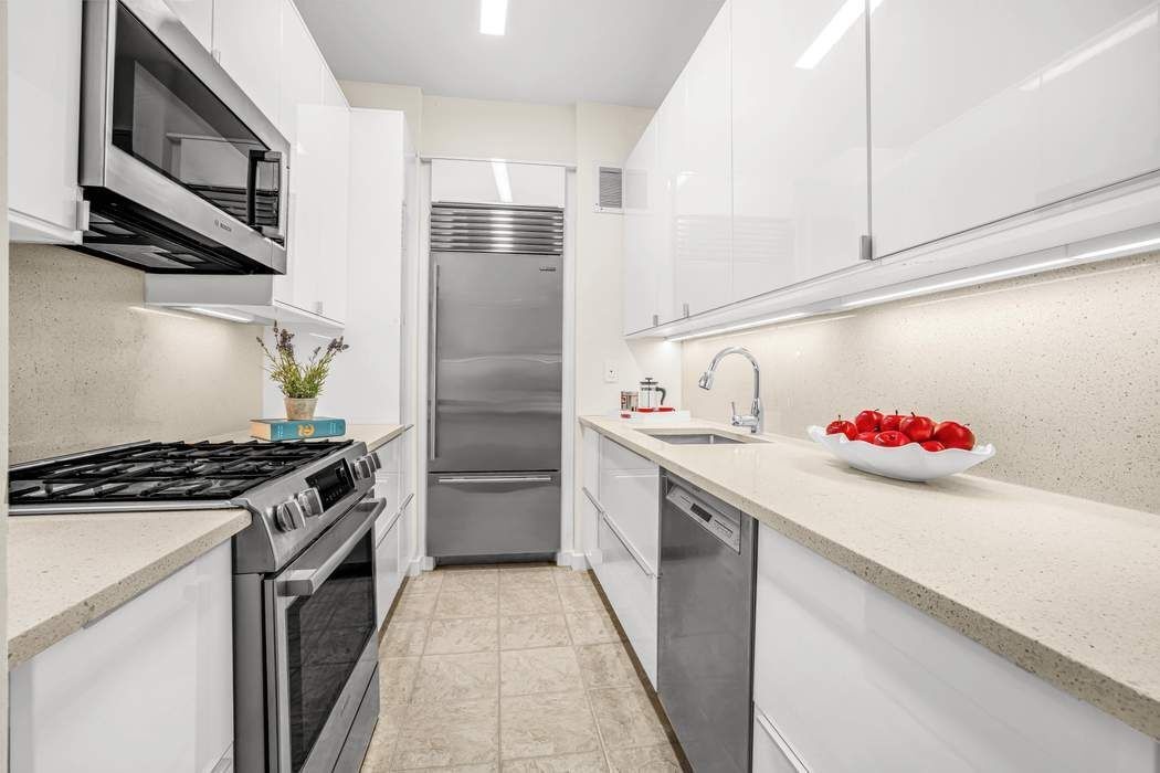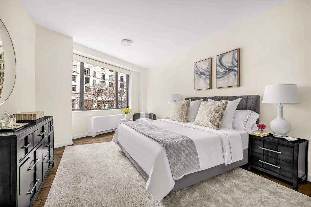 Nestled in the treetops, the light-filled corner living and dining room has views that stretch from the New York State Theater to Central Park as well as north and south along Broadway. The effect is a panoramic view of this prime Upper West Side neighborhood where the best of New York living is easily within reach. Within the unit, there are three spacious bedrooms, three baths and a well-appointed kitchen roomy enough for a breakfast bar or casual dining area. A washer and dryer are conveniently located within the unit. The primary bedroom is large enough to accommodate a separate sitting area and has an en-suite bath which includes a deep soaking tub plus a walk-in shower. The oversized second bedroom also has an ensuite bath and can comfortably fit a separate sitting area or desk. Throughout, 9-foot ceilings and oversized windows make for an open and airy feeling within every room and an apartment that feels and lives much larger than its size.