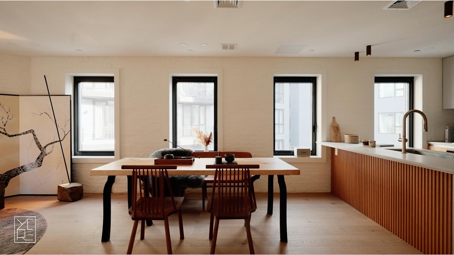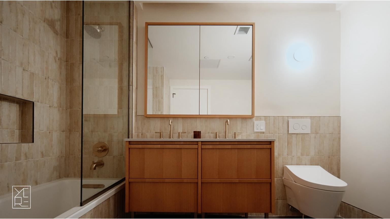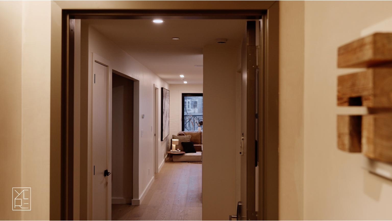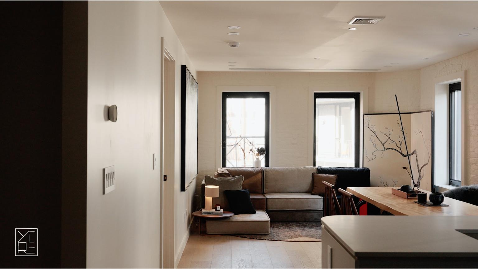 Bathrooms are finished in lime wash and appointed with heated floors, heated towel racks, and TOTO Washlet toilets, offering a calm, spa-like experience grounded in comfort and restraint. Smart living is fully integrated with a Nest smart home system, smart lock entry, and ButterflyMX virtual doorman system, while an in-unit washer and dryer add everyday ease.