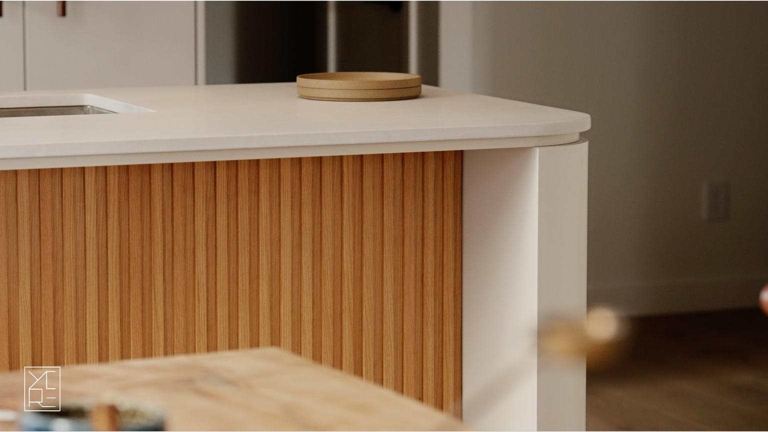 European white oak flooring runs throughout, bringing warmth and continuity to the space. Interiors are composed of custom millwork and thoughtfully selected finishes, with white exposed brick adding subtle texture and warmth. Kitchens feature a Fisher & Paykel appliance package and a sculptural island with softly curved edges, designed for both everyday living and effortless entertaining.