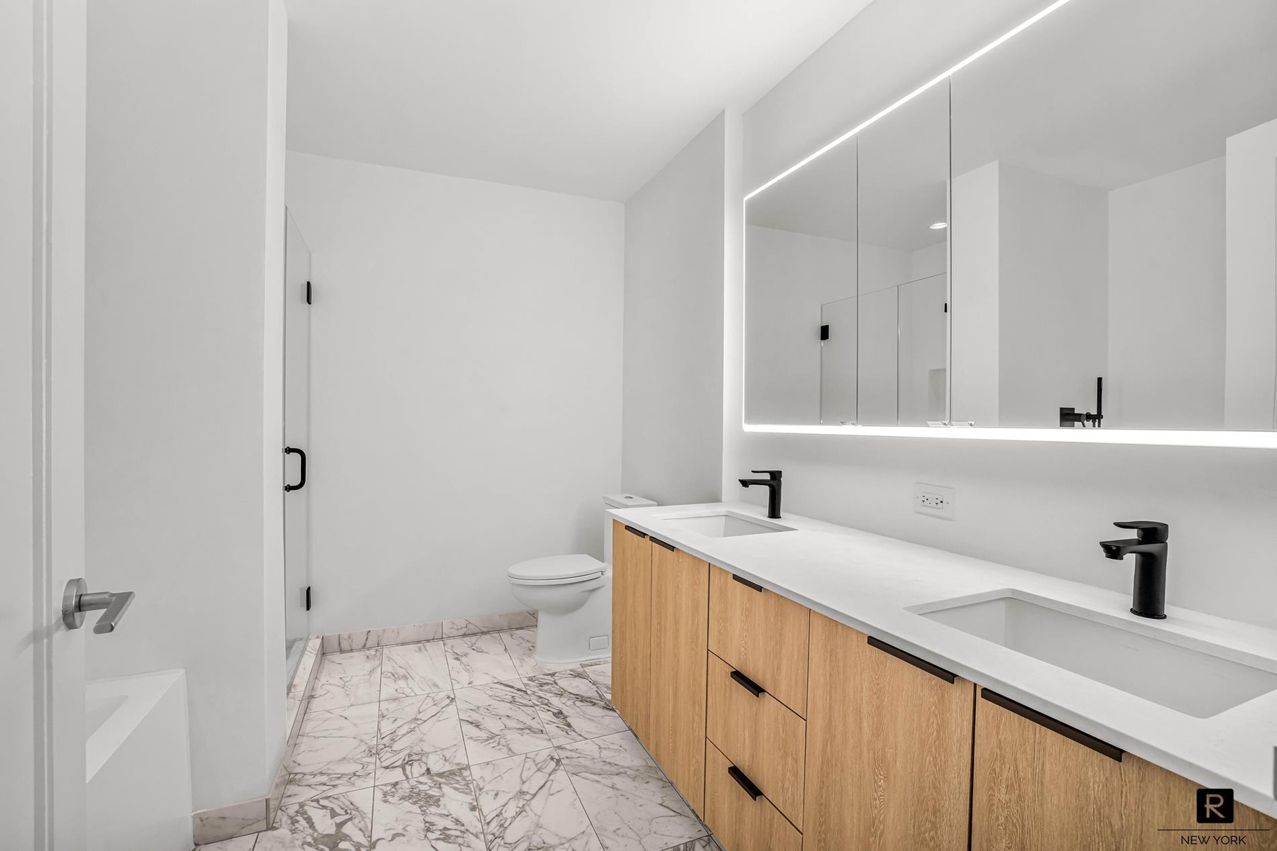 As you head back towards the bedrooms you will notice the apartment has plenty of storage with two foyer closets and a separate washer/dryer space. The master bedroom is incredibly spacious, filled with light and enjoys the privacy of high-floor, west view and features three large closets and an ensuite five fixture, all-new bathroom. The second bedroom is generous in size, has similar privacy and includes floor to ceiling windows looking out over the Hudson, custom cabinetry with a built-in Murphy bed frame and its own en-suite renovated bathroom. Additional apartment features include: motorized shades through-out, tall ceilings and multi-zone thermostatically controlled a/c and heat.