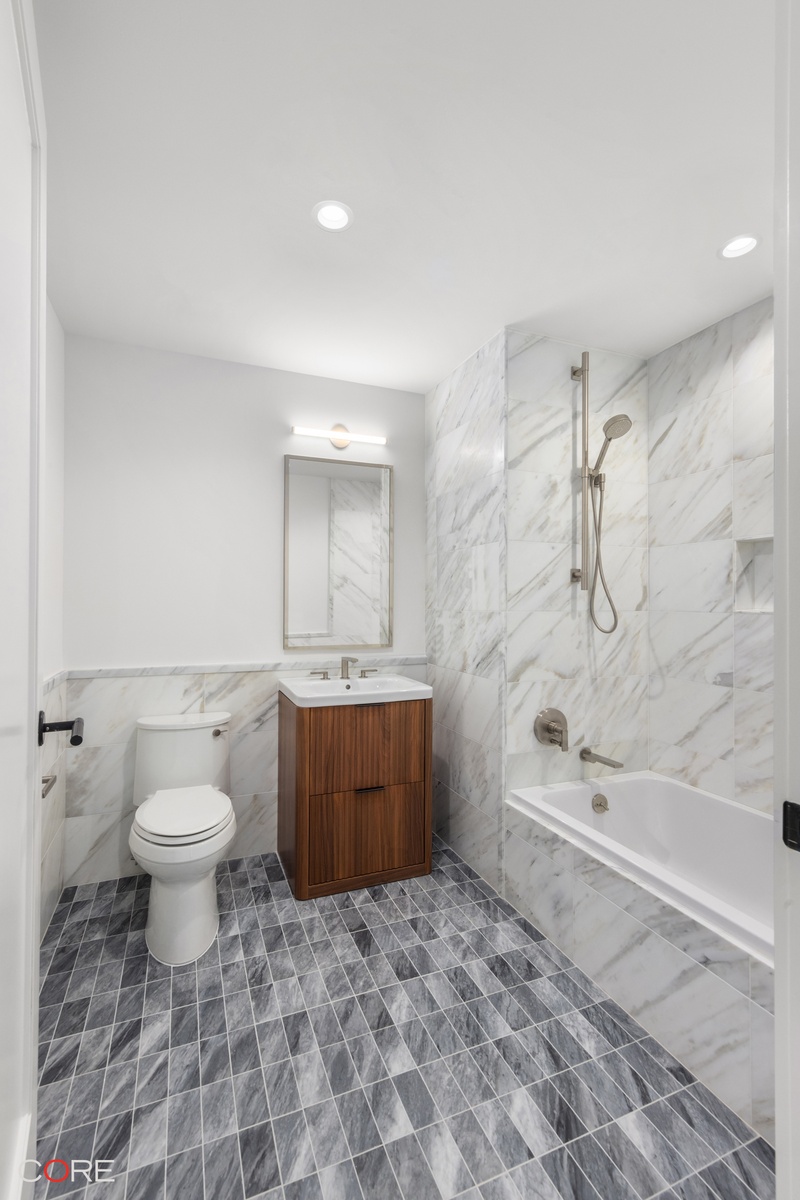 Each bedroom is bright and airy with generous closet space. The bathrooms feature a 60” tub shower, custom walnut vanity, honed Barri Grey tiled marble floor, honed Empress White marble tile wall, brushed nickel fixtures, and radiant heat flooring in the primary.