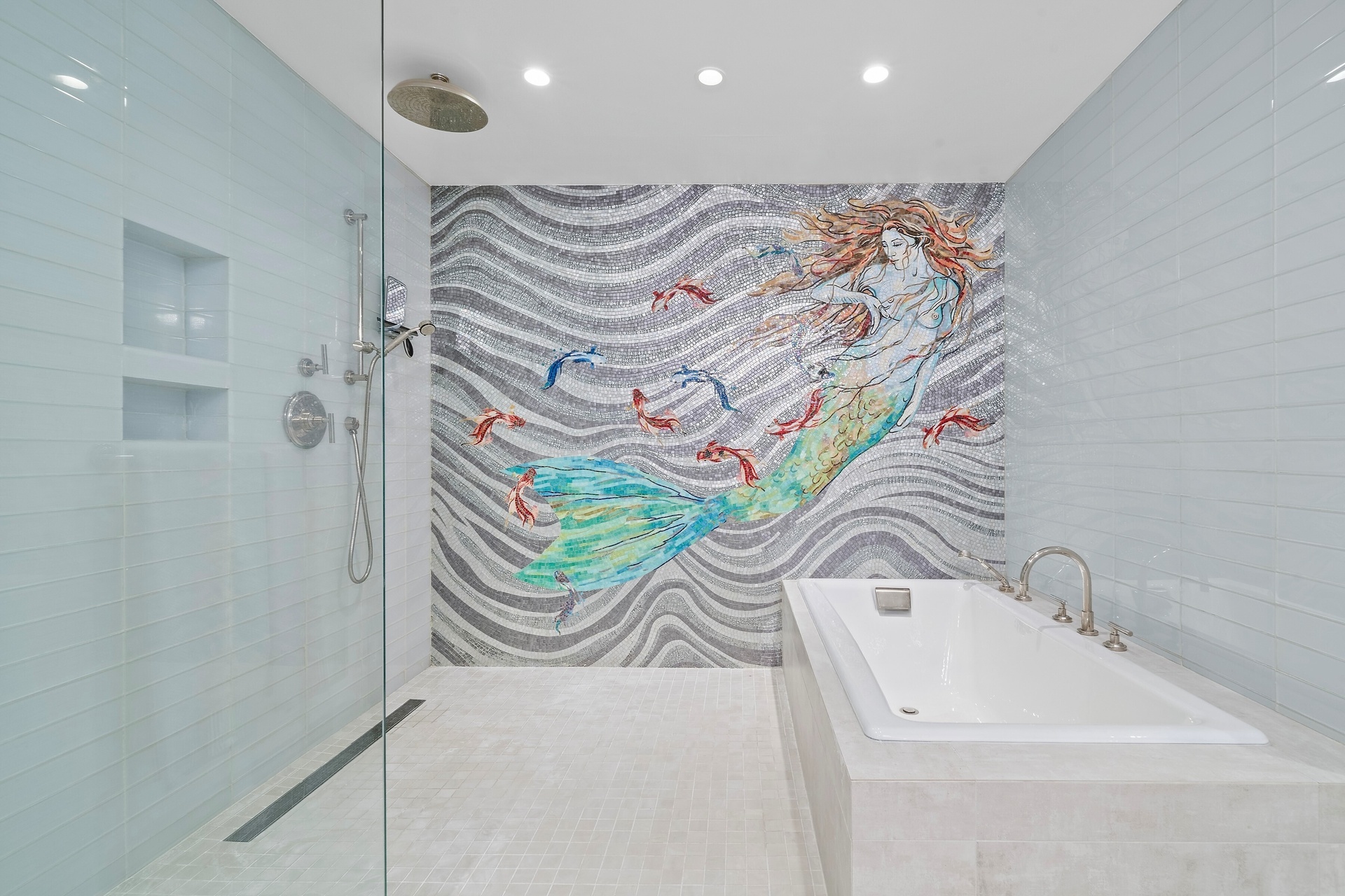 The primary suite is both quiet and bright, featuring a large walk-in closet. The en-suite bathroom includes dual sinks, an enclosed glass shower with a custom Murano mosaic tile wall, and a deep soaking tub.