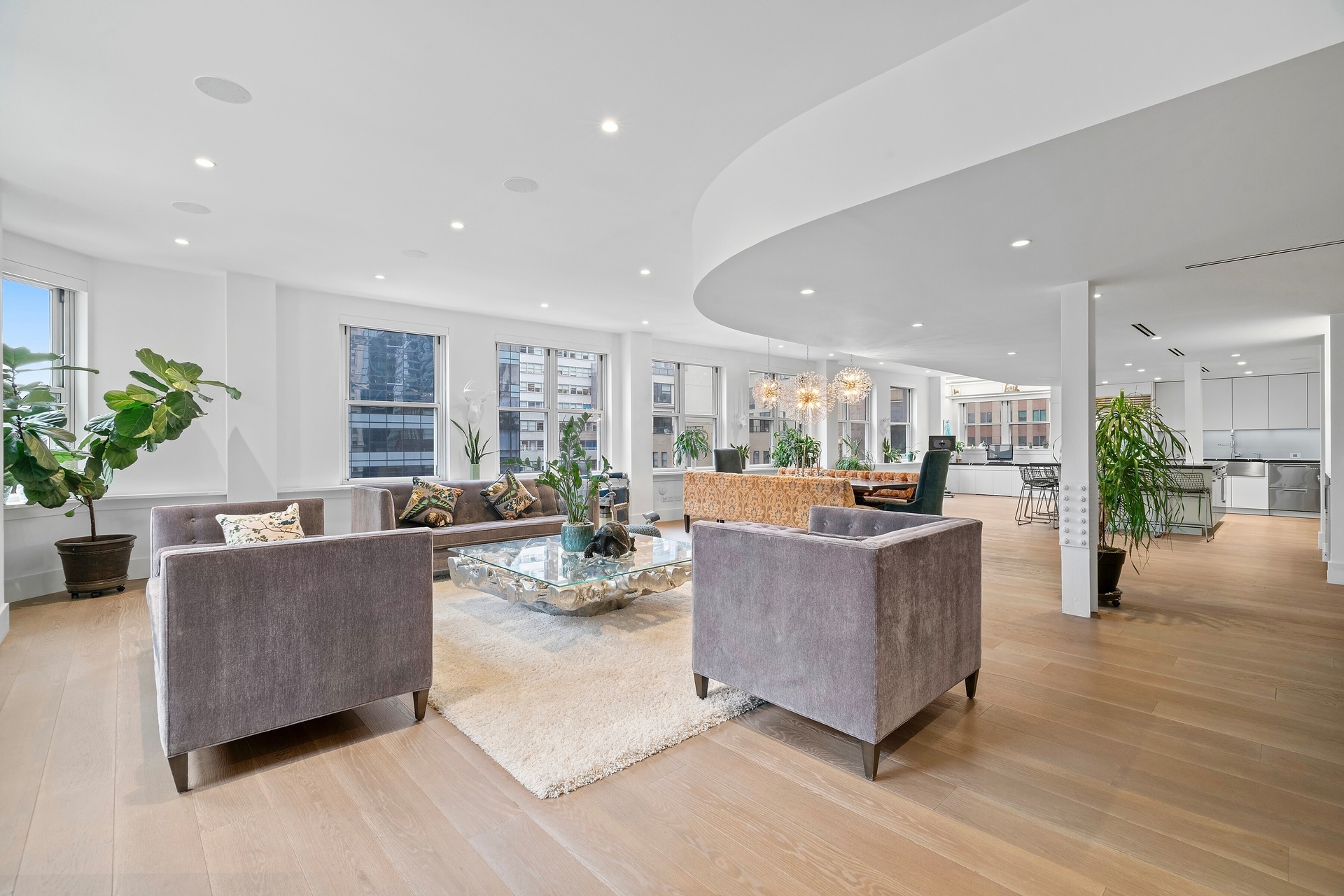 Approximately 2,280 square feet of living space, easily configured into a spacious 2 or 3 bedroom home. Currently designed as an expansive open loft with triple exposure, the layout offers exceptional flexibility to create a custom residence tailored to your needs. Thirteen oversized windows frame sweeping panoramic views of the Financial District, the Seaport, and the Brooklyn Bridge, all set above elegant Carlisle wide-plank oak floors. High ceilings and three exposures flood the living, dining, and gallery areas with natural light throughout the day.