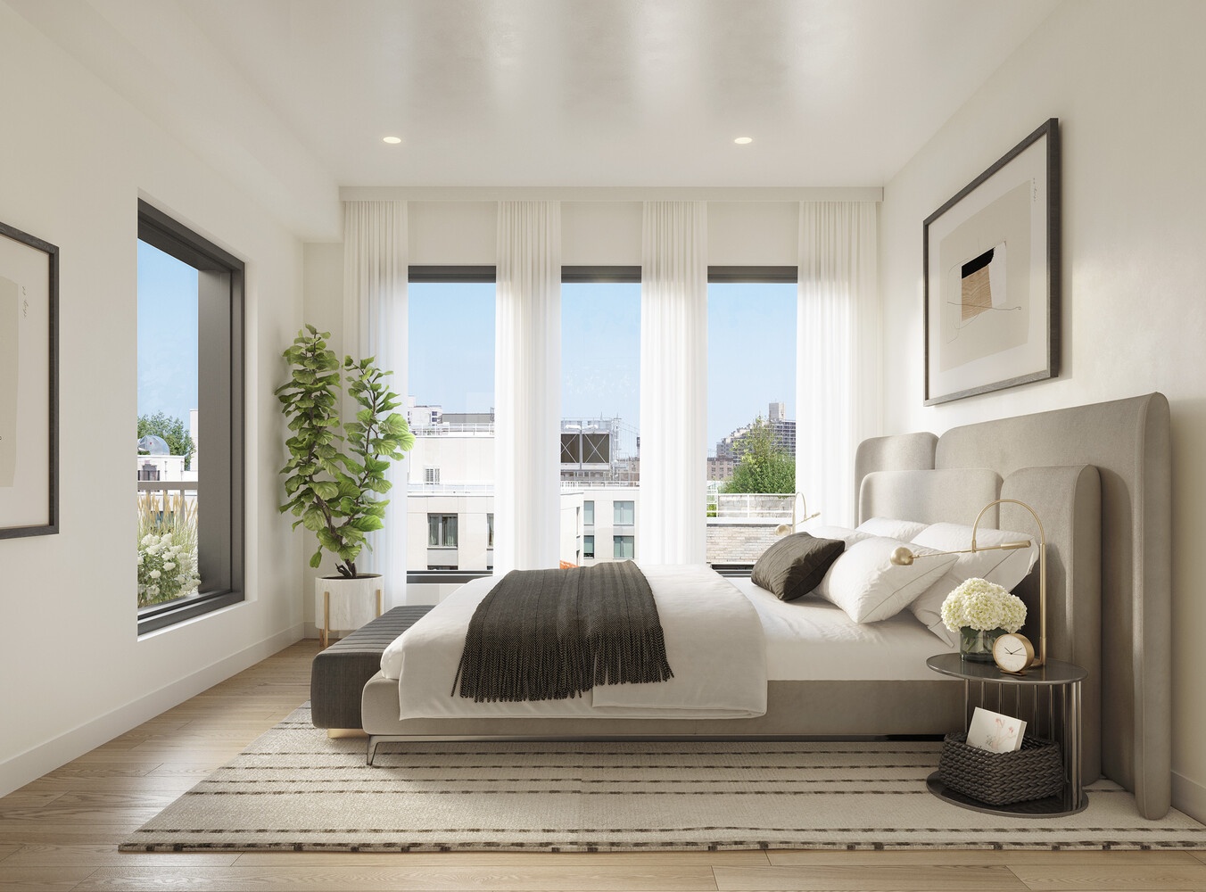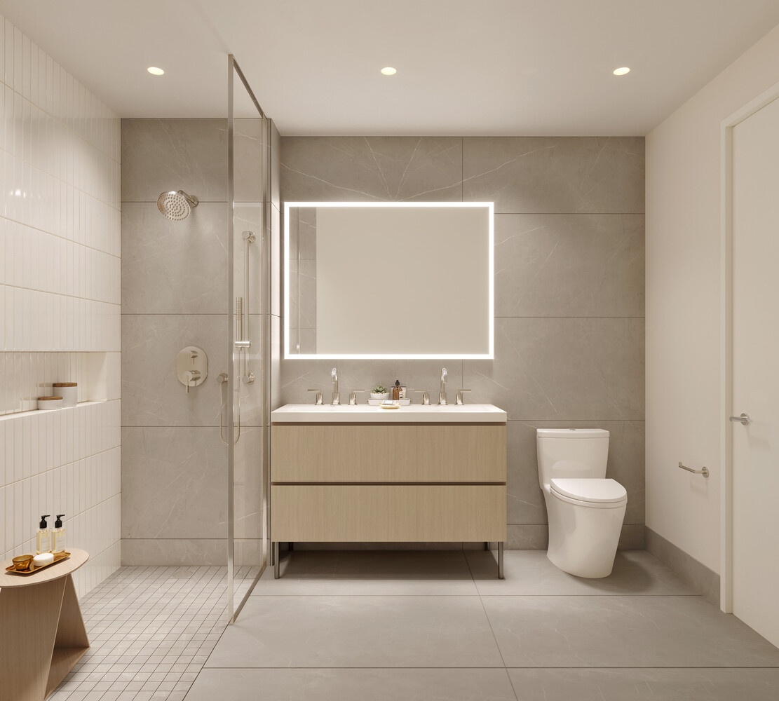 Wide plank engineered oak floors, recessed lighting, large framed windows, and a well-designed layout create a bright and efficient living space. The bedroom accommodates king-sized furniture with large closets and excellent natural light thanks to its dual north and east exposures-an extra window from your private balcony gives extra dimension. The private balcony spans nearly 90 square feet-the largest among the one-bedroom residences at VELA-creating a rare opportunity for generous outdoor living.